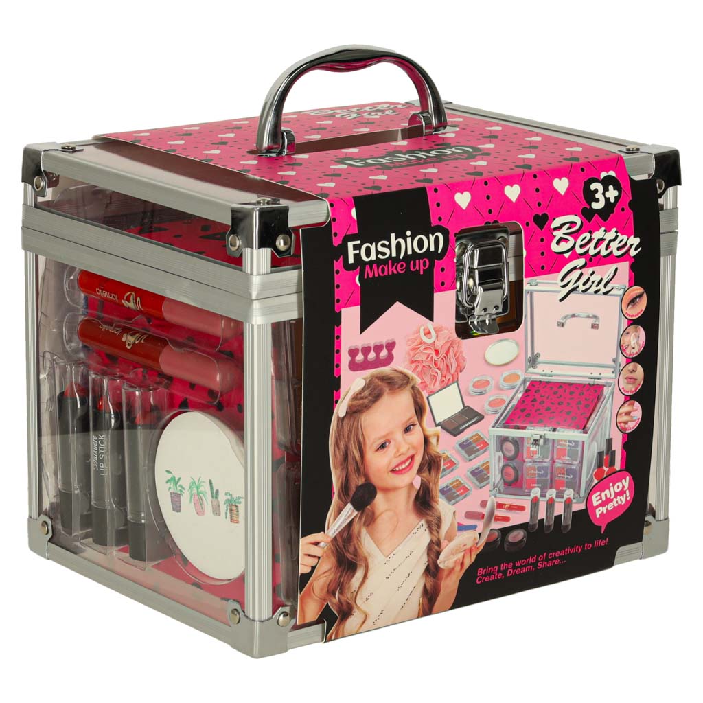 Does your daughter watch you do your makeup? Is she fascinated by the colors? Does she like to “paint” dolls and teddy bears? This XXL kids makeup set is the perfect answer to her interests. In addition, the trunk looks professional – metallic border, carrying handle, transparent walls, are impressive. It’s not a toy – it’s a trunk world of styling for a little princess.