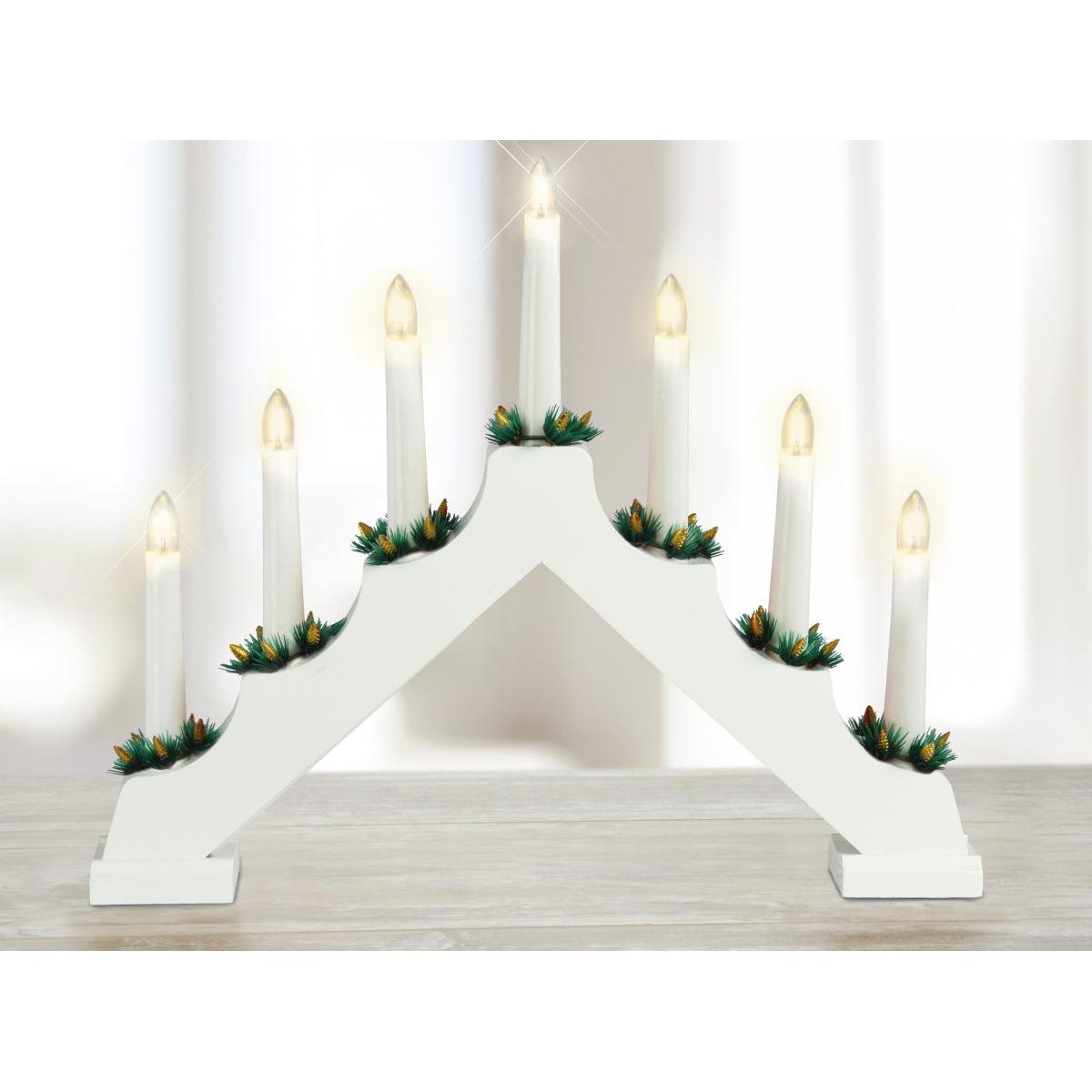 Modern advent lights can come in different shapes, they can be in glamour or ECO style, they can be with glitter or LED lights. This lamp has a traditional shape and imitates 7 candles set on a wooden frame.