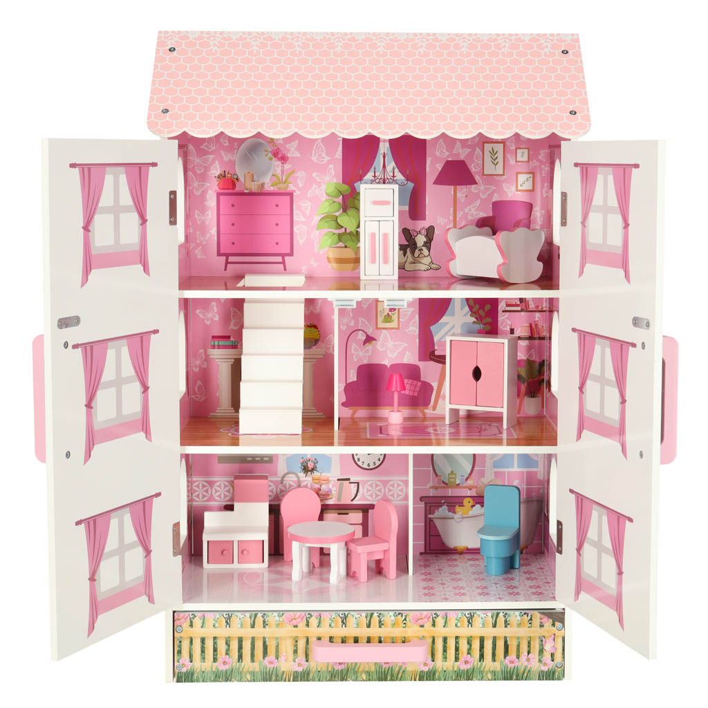 Openable doll house in charming style will not only be a place for creative play but also a decoration of children’s room. The house has three floors in which there is a kitchen, bathroom, bedroom, living room and staircase. The magnet lockable door and drawer make it easy to keep the room tidy – just clean up the toys inside after playing.