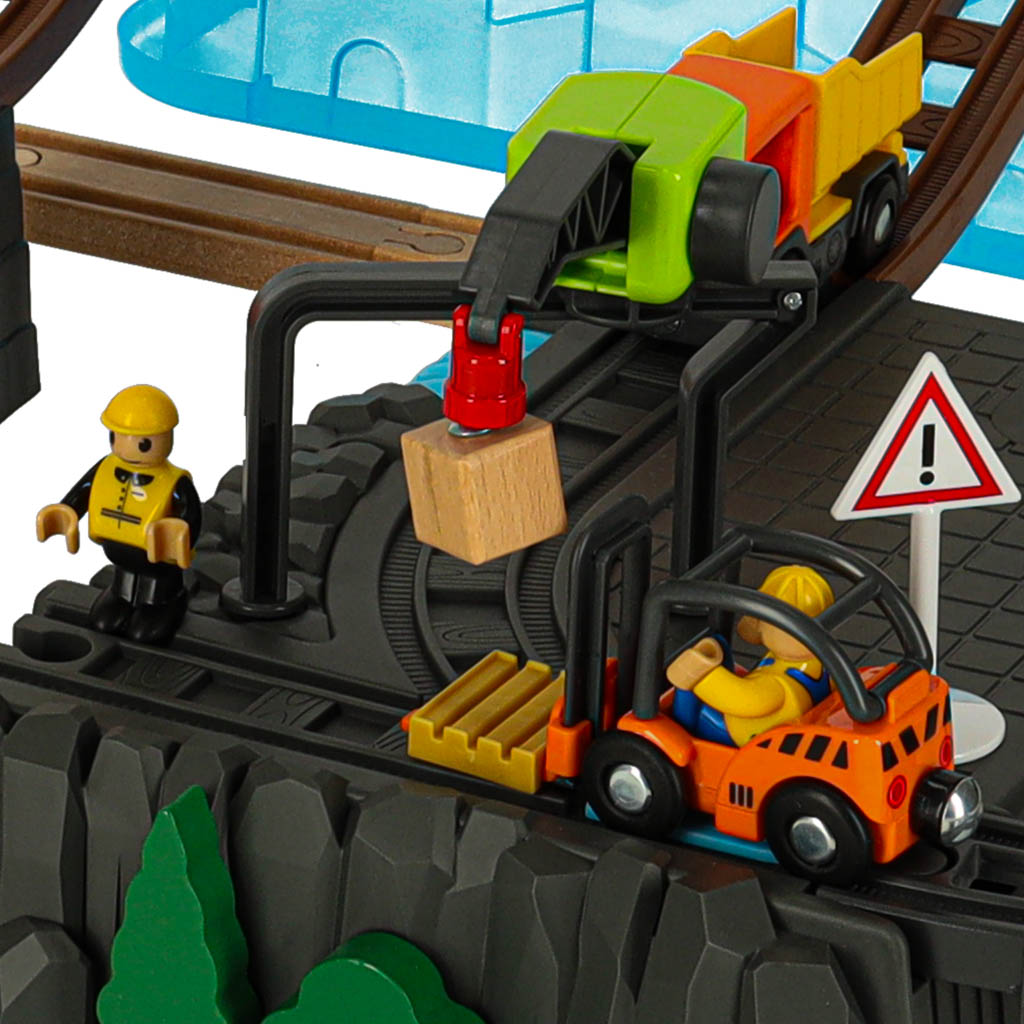 On one hill there is a crane, which helps to unloador load cargo from the train – the scenario of play depends on the child’s imagination. Accessories such as road signs, cones, trees and figures allow you to complete the scenery around the built track.
