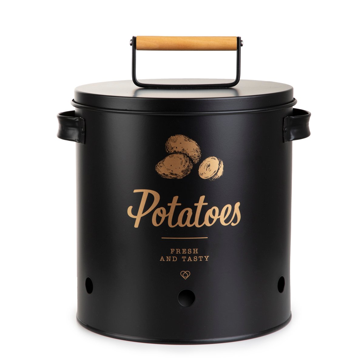 The YENNIS container is designed for storing potatoes, but you can also place other vegetables that require a dark and cool place. The container is black in color, decorated with gold graphics and an inscription that indicates its contents. It is ideal for placing in the kitchen, cellar or pantry.