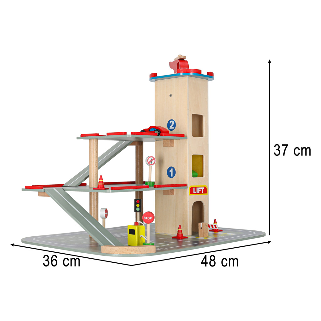 Skaistajai koka pilsētas garāžai ir četri līmeņi! Pirmie trīs ir paredzēti automašīnām – tur ir vieta komplektā iekļautajām koka automašīnām, kā arī daudziem citiem jūsu bērna transportlīdzekļiem. Uz nākamajiem līmeņiem var nokļūt ar liftu!
