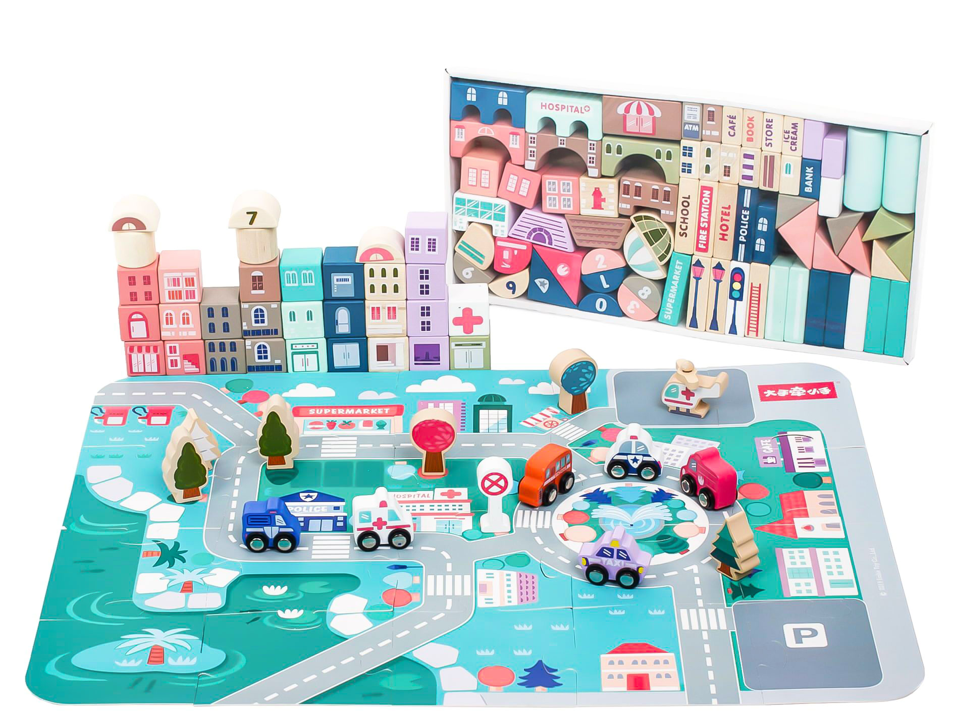 Koka izglītojoši bloki pilsēta ar paklājiņu 115 gab ECOTOYSKoka izglītojoši bloki pilsēta ar paklājiņu 115 gab ECOTOYS