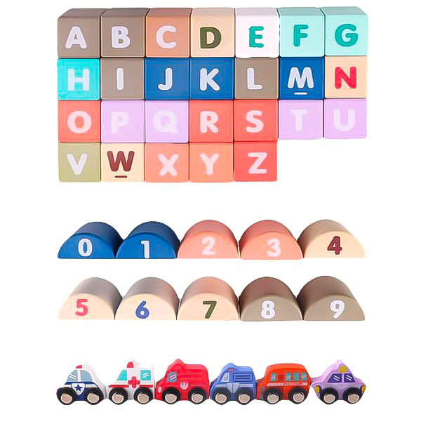 Bloku aizmugurē mēs varam atrast alfabēta burtus un ciparus. Spēlējoties un būvējot pilsētu, bērns iemācīsies atpazīt visus burtus, pateicoties kam viņš ne tikai attīstīs savu radošumu, bet arī spers pirmos soļus lasīšanas un rakstīšanasvirzienā.
