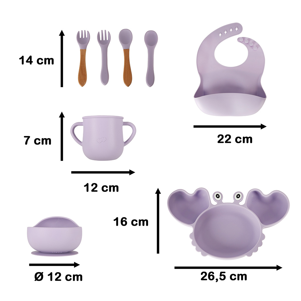 Silikona bērnu trauki baby crab komplekts 9 gabaliņi violeta krāsā