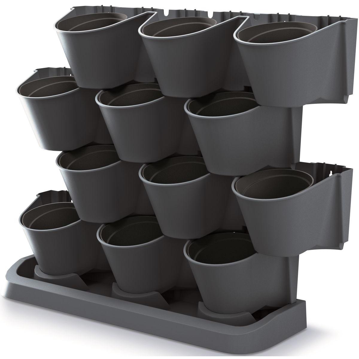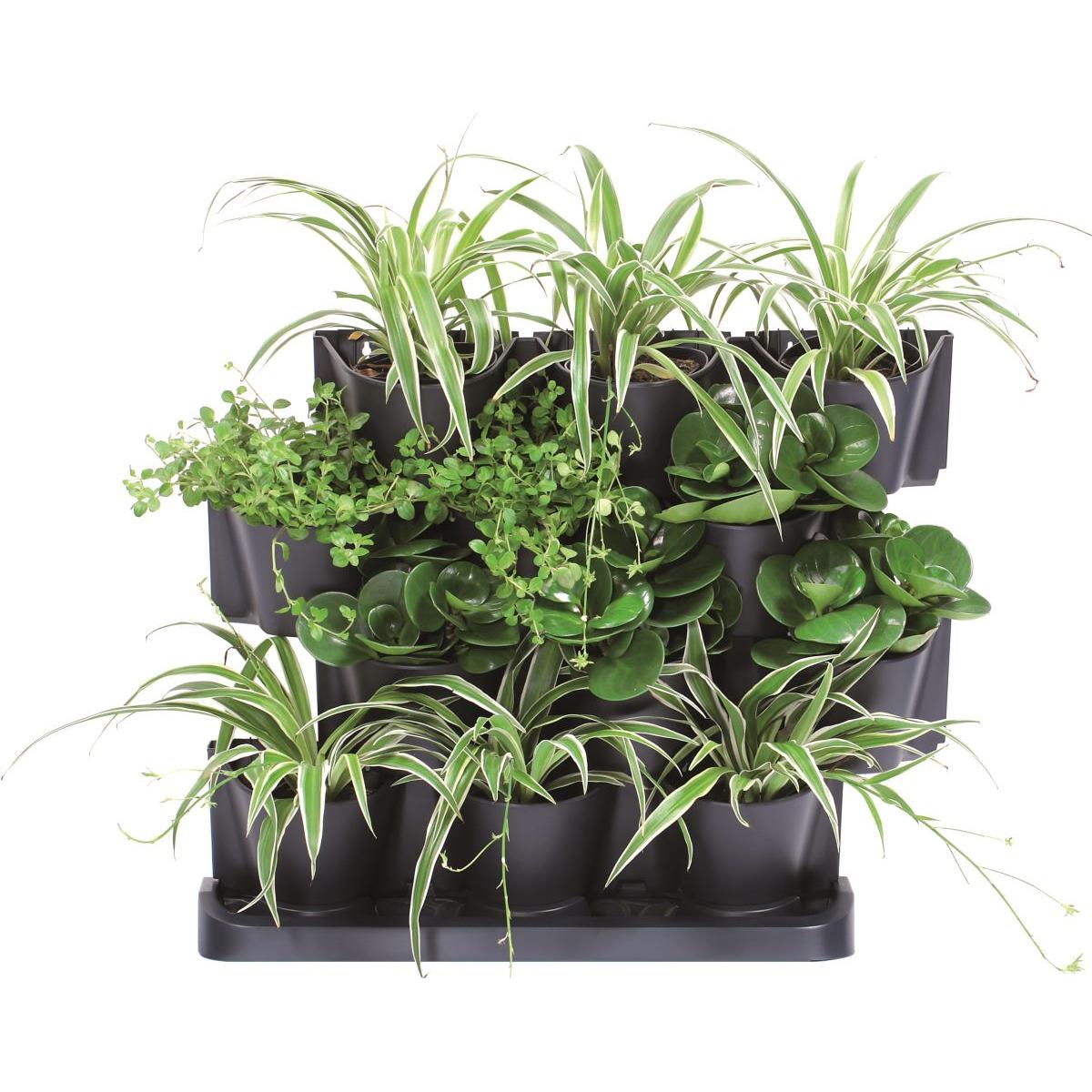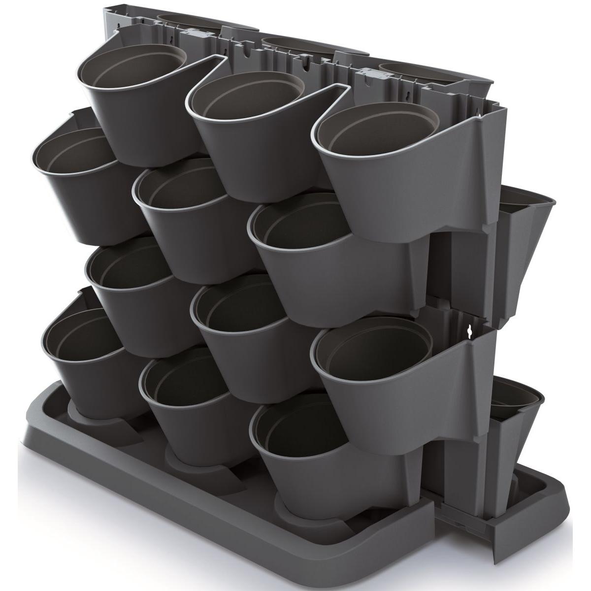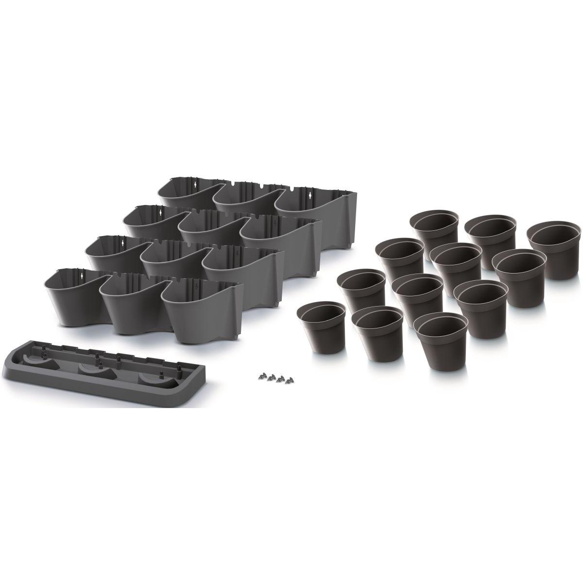 - Komplektā ir 21 detaļa: Komplektā ietilpst: 4 moduļi ar 3 caurumiem podiem, 12 puķu podi, 1 drenāžas pamatne, 8 savienojumi ar citiem moduļiem.