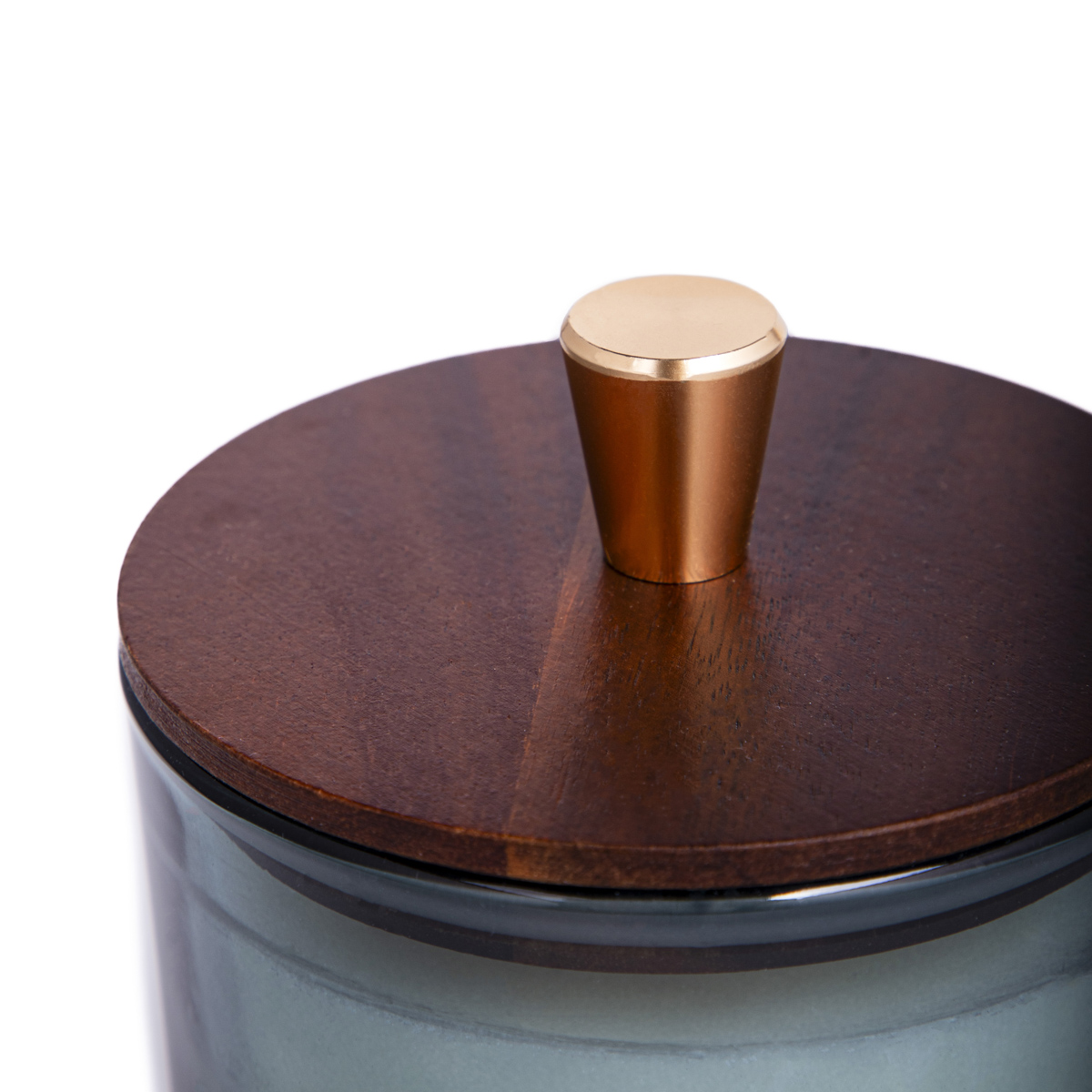 Свеча заключена в стильный стеклянный контейнер темного цвета. Деревянная крышка с металлической ручкой не только подчеркивает ее роскошный дизайн, но и защищает аромат, когда он не используется, сохраняя интенсивность аромата дольше.