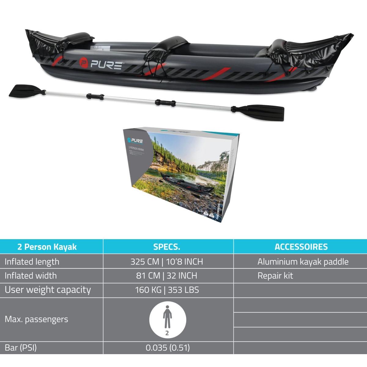 Изготовленный из прочного материала толщиной 0,38 мм, в надутом состоянии он имеет длину около 325 см, ширину 81 см, высоту 53 см и грузоподъемность до 160 кг. Оснащенный двумя надувными сиденьями, он идеально подходит для двух человек.