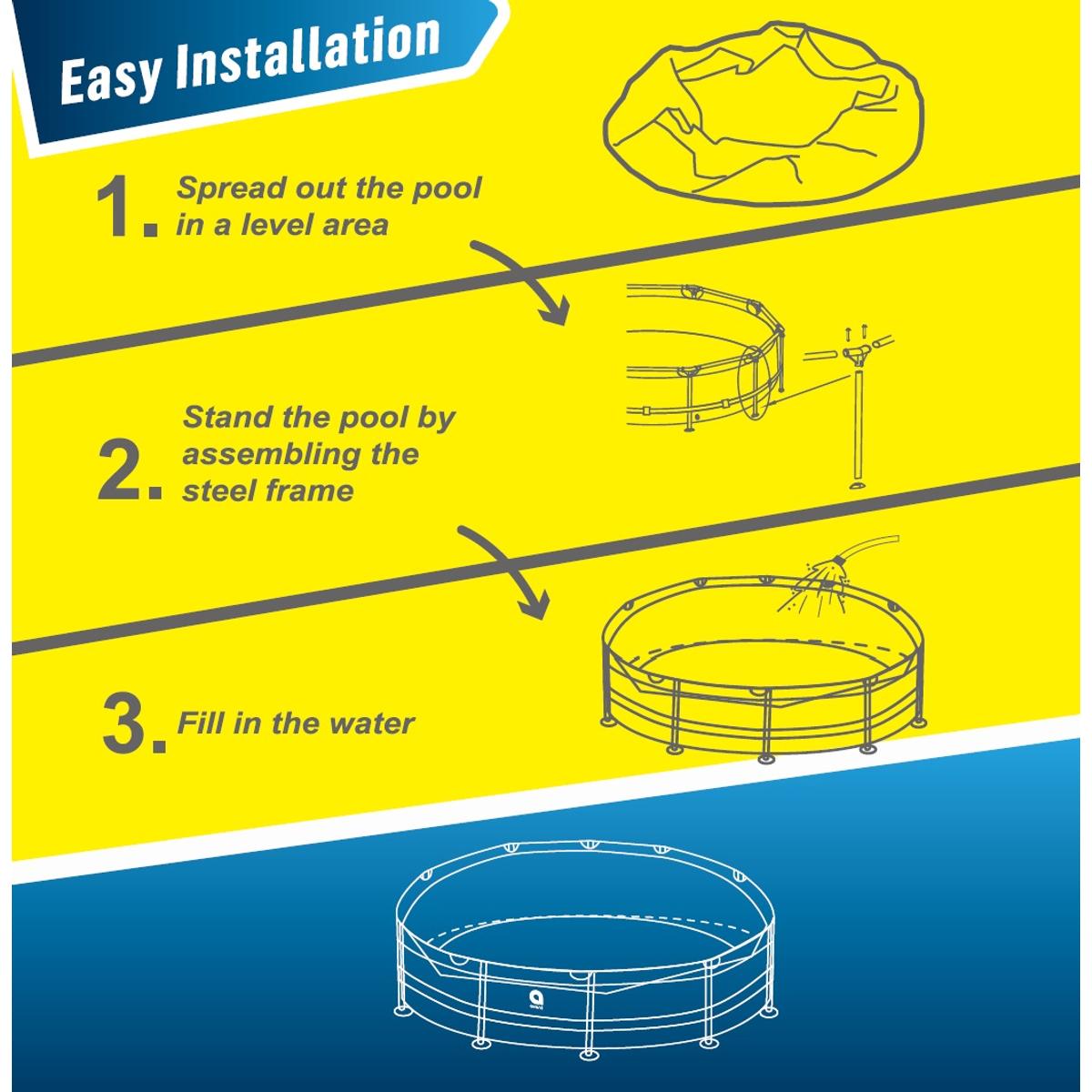 Сборка бассейна очень проста и не требует специальных инструментов. Стальной каркас и стойки быстро собираются вместе, образуя устойчивую конструкцию для безопасного и комфортного использования. Готов к наполнению водой в кратчайшие сроки!
