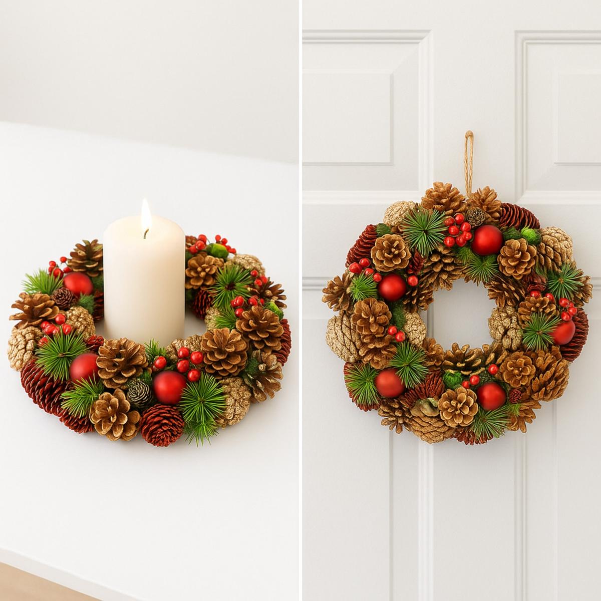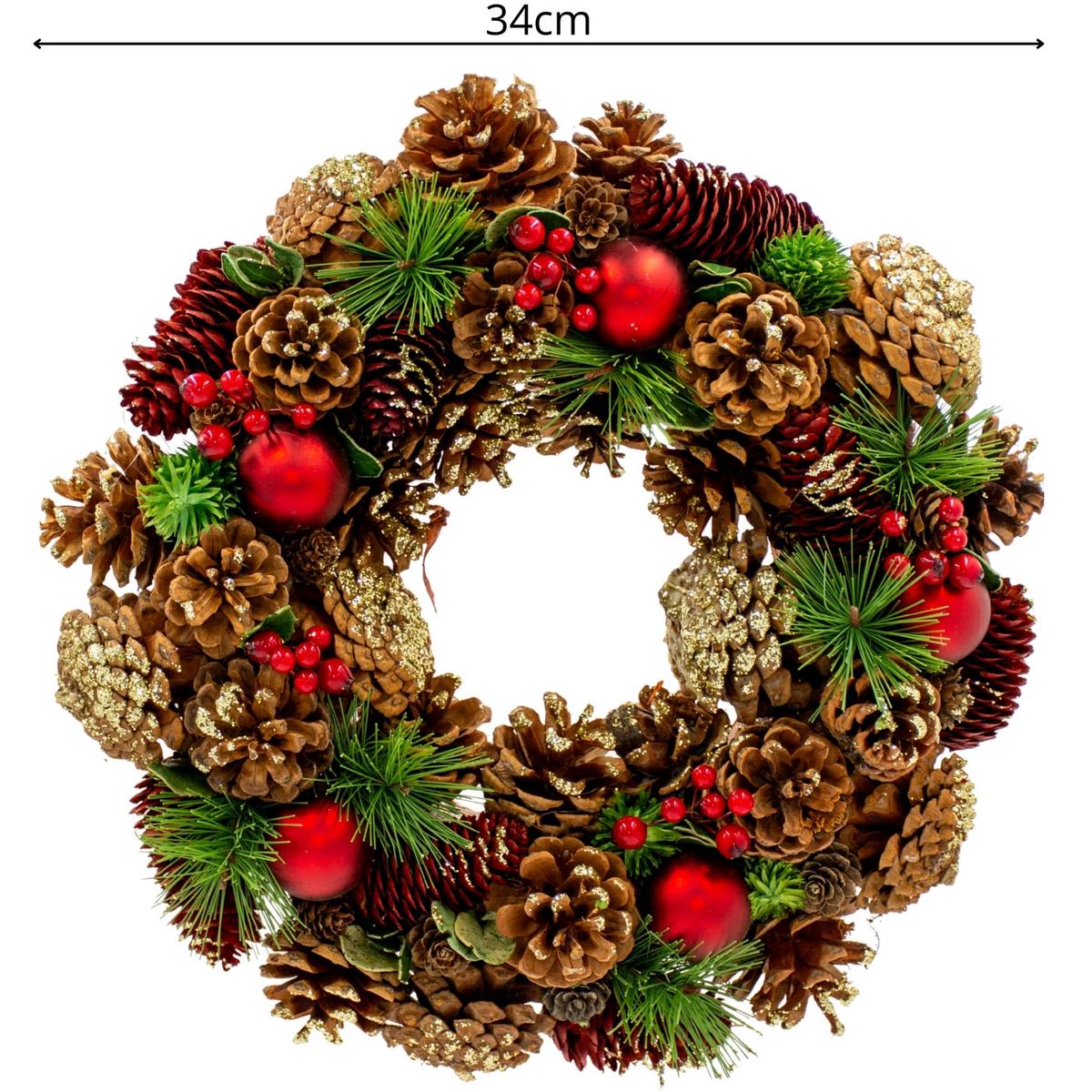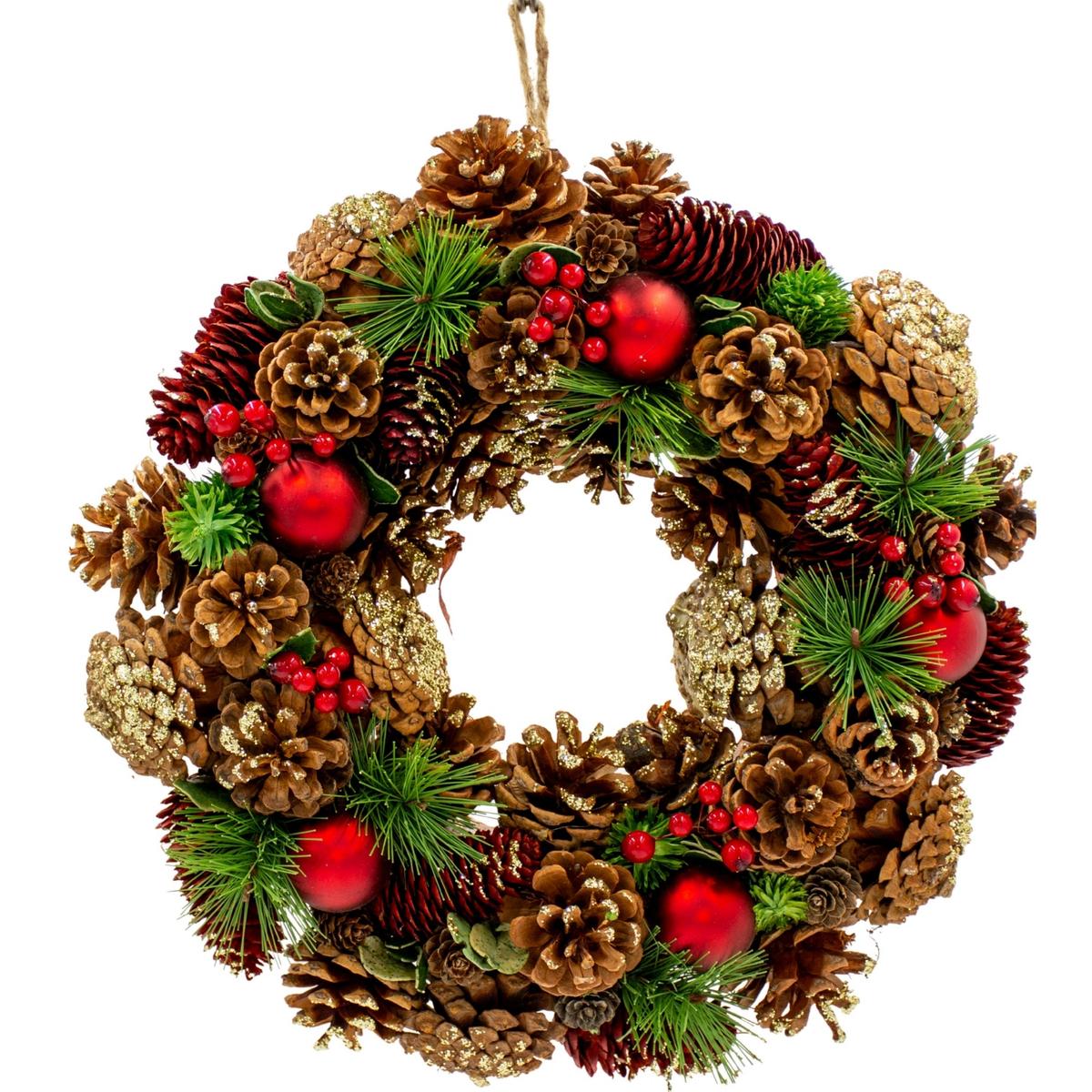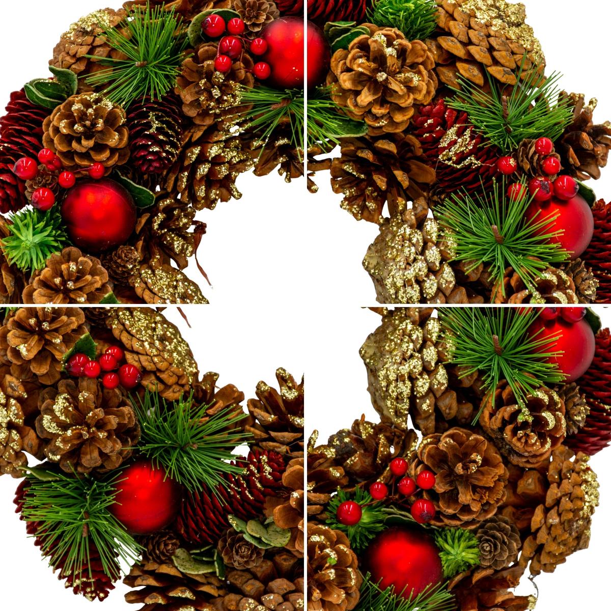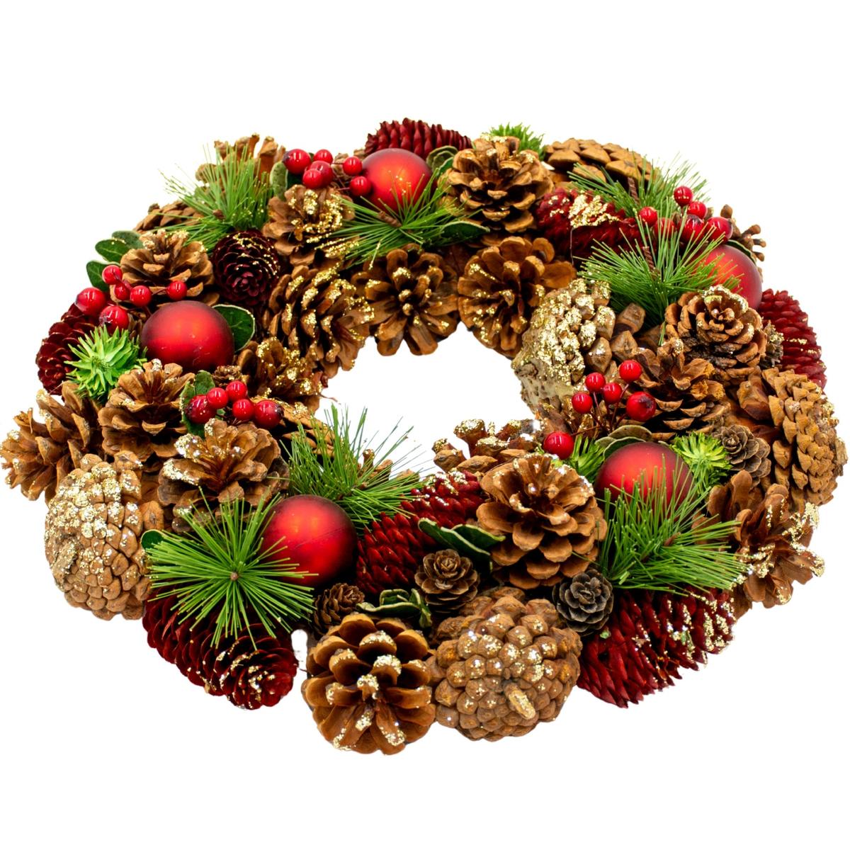Шишки, красные баулы, золотые элементы и ягоды создают полную, праздничную композицию. Каждая деталь тщательно подобрана, чтобы придать всему образу особую величественность.