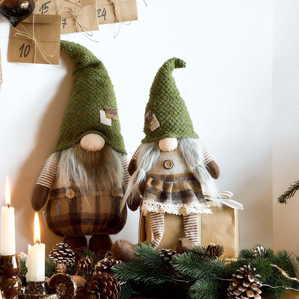 Сидящий гном ALTIN — очаровательное рождественское украшение. У гнома характерная зеленая шляпа, закрывающая глаза, и стильный наряд, выполненный в бежевых и коричневых тонах.