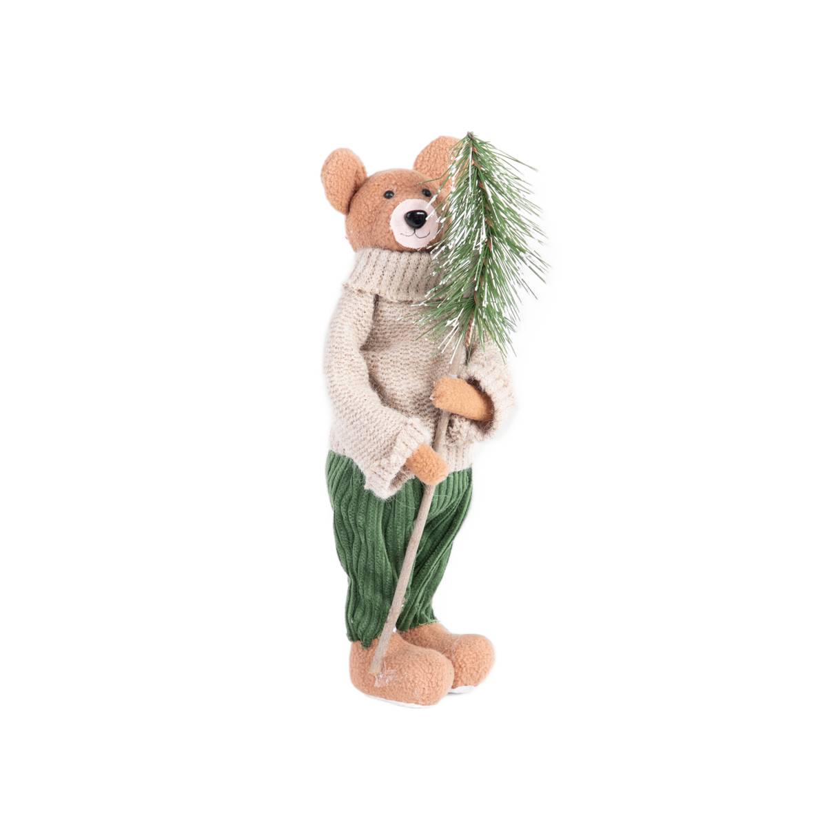 Рождественская фигурка изображает плюшевого мишку в зимнем стиле, идеально передавая тепло и волшебство праздников. Мишка одет в мягкий джемпер кремового цвета с высокой водолазкой и зеленые брюки. В руках он держит маленькую елочку, благодаря чему вся фигурка излучает праздничную атмосферу и напоминает нам о подготовке к Рождеству.