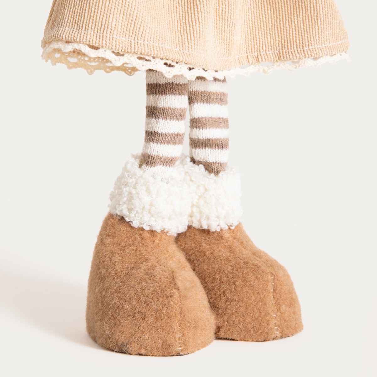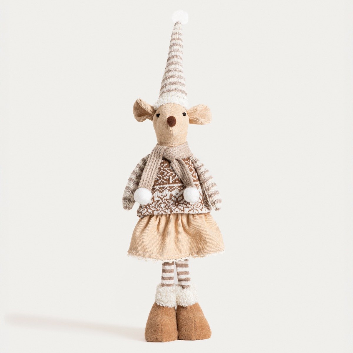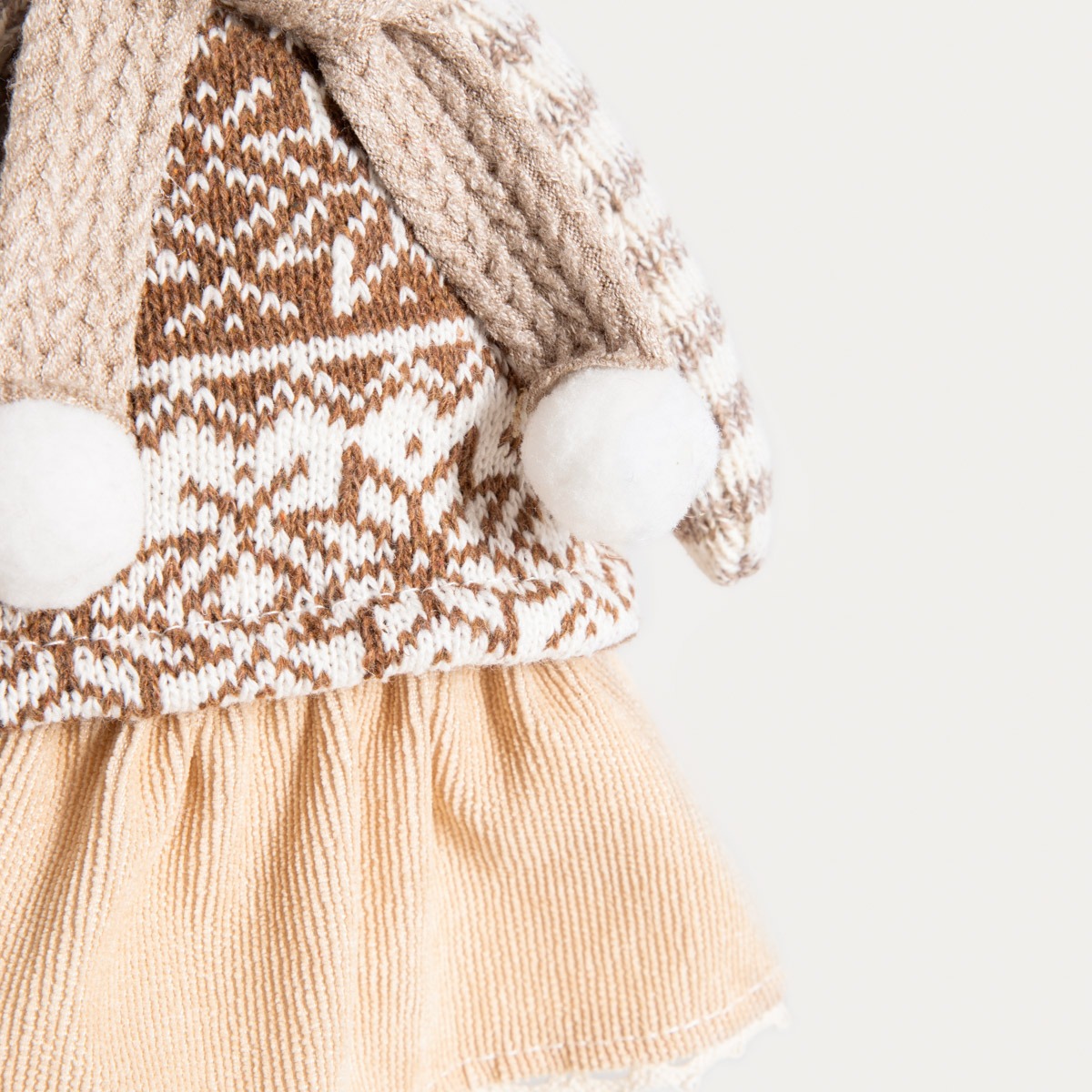 Мышка-норушка одета в джемпер, юбку, шапку и шарф. Элементы костюма украшены помпонами и овчиной. Гном бежевого цвета с теплым оттенком. Он станет прекрасным дополнением к вашему интерьеру, добавив в него очаровательный и уютный штрих.