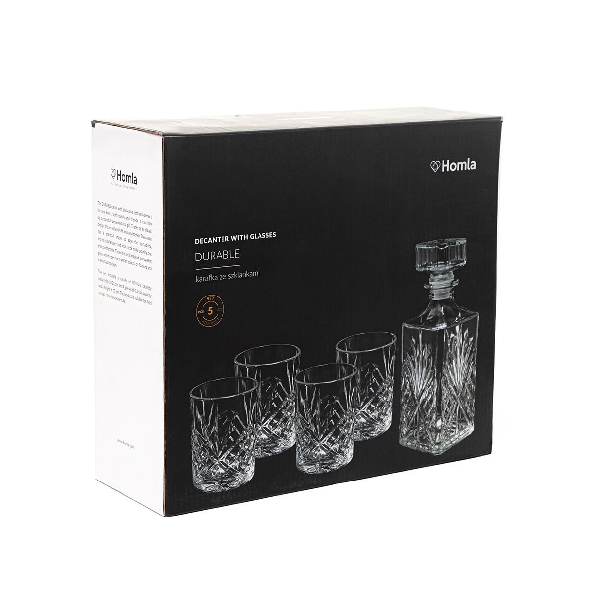 Прочный графин и прилагающиеся к нему бокалы изготовлены из высококачественного стекла, что делает изделия долговечными и придает им элегантность. И графин, и стаканы можно мыть в посудомоечной машине, что облегчает их очистку.