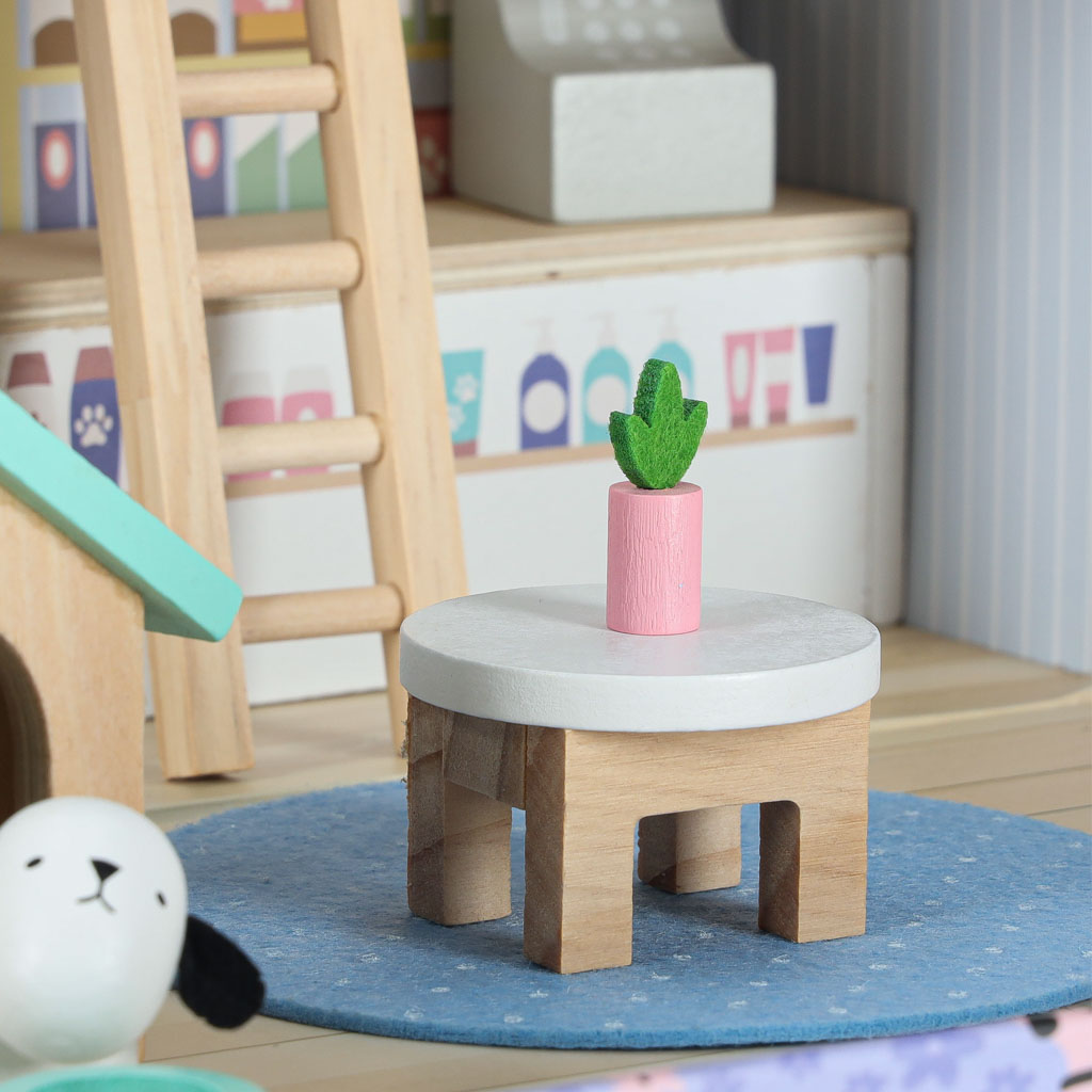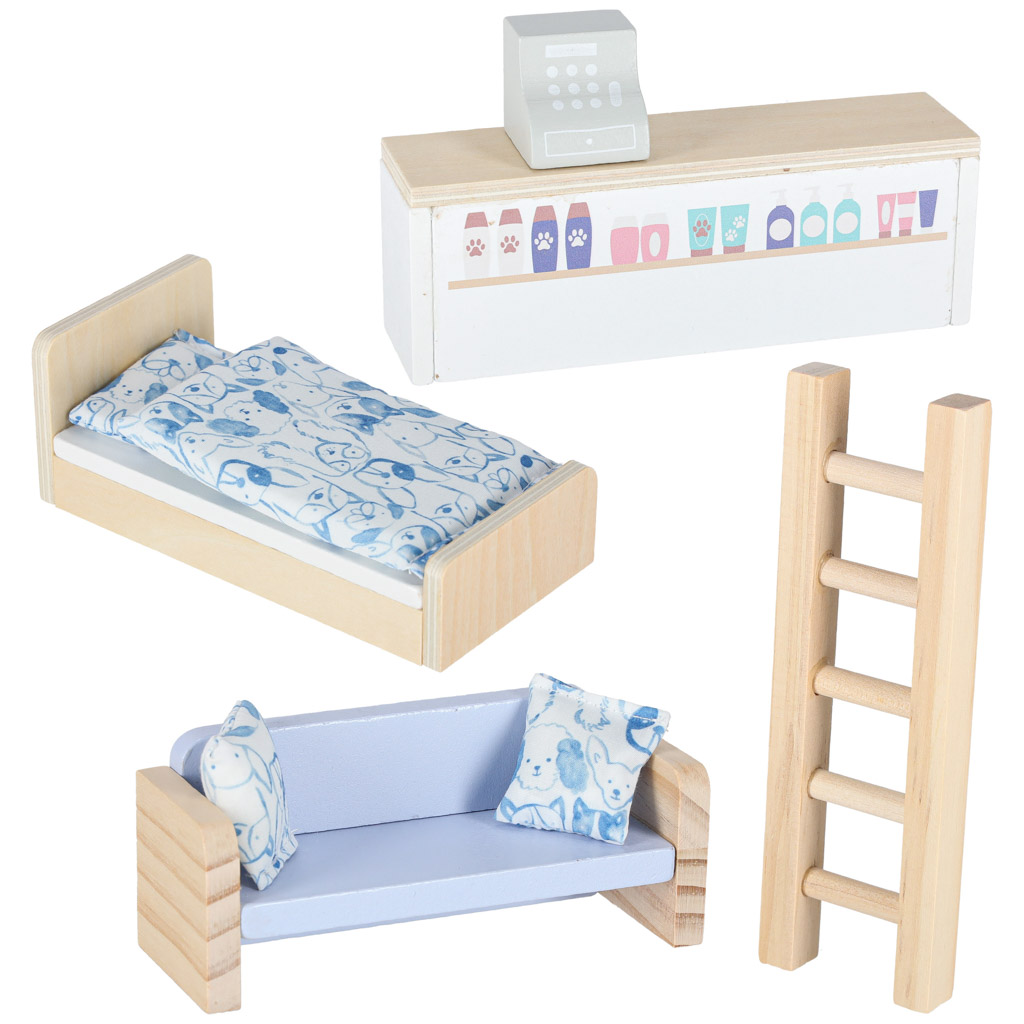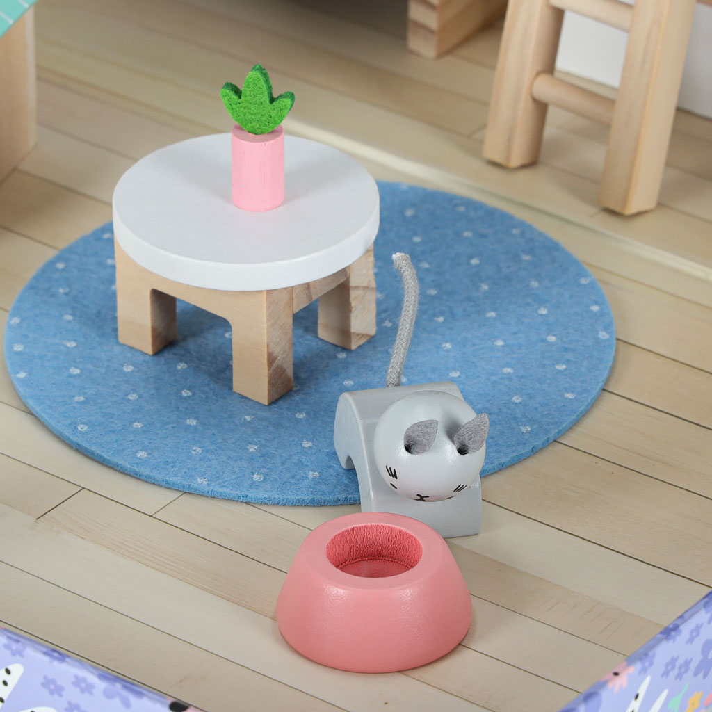 В доме живут собака и кошка — у них есть свои миски, а также лежанки в виде конуры и когтеточки. Различные аксессуары в наборе предлагают множество идей для творческой игры. После использования мебель можно убрать обратно в чемодан, что позволяет поддерживать порядок.