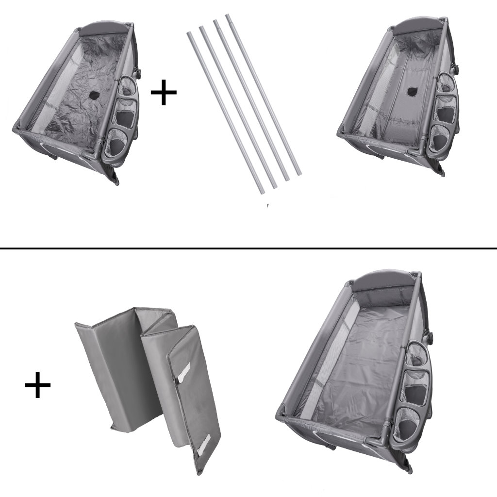Помимо прочего, кровать оснащена съемным вторым спальным местом и пеленальным столиком с карманами. Такие удобства добавляют ей функциональности, делая ее подходящей для коротких и длительных поездок. Х-образная конструкция, нескользящие ножки и блокируемые колесики делают кровать практичной и устойчивой. Продуманное расположение карманов и отделений облегчает распаковку и организацию багажа. Кровать с пеленальным столиком обеспечивает комфорт при переодевании и перекладывании малыша.