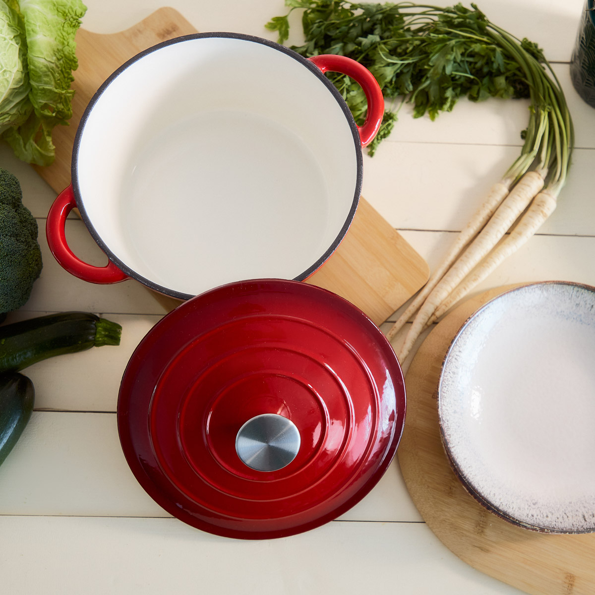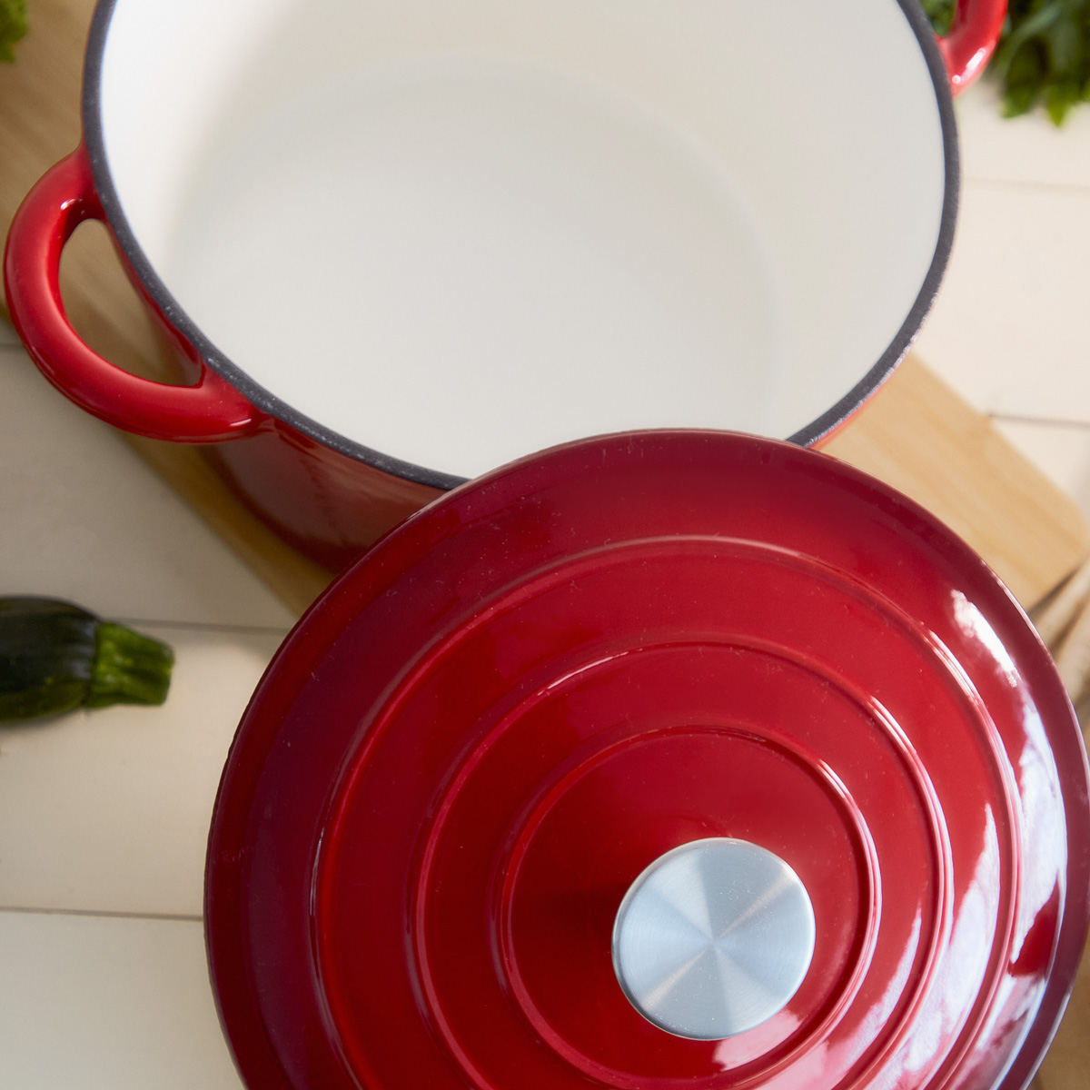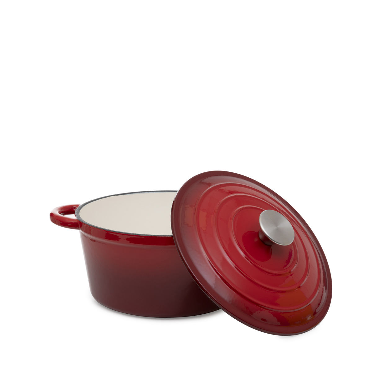 Чугунная кастрюляHOMLAANDREAS позволяет готовить вкусные блюда на всех типах плит и в духовке. Он идеально подходит для использования в качестве посуды для запекания или жаропрочной посуды для запекания. Мы покрыли ее красной эмалью, благодаря чему она легко моется и прекрасно выглядит. Вы можете смело ставить ее на стол, чтобы подавать горячие блюда прямо из кастрюли.