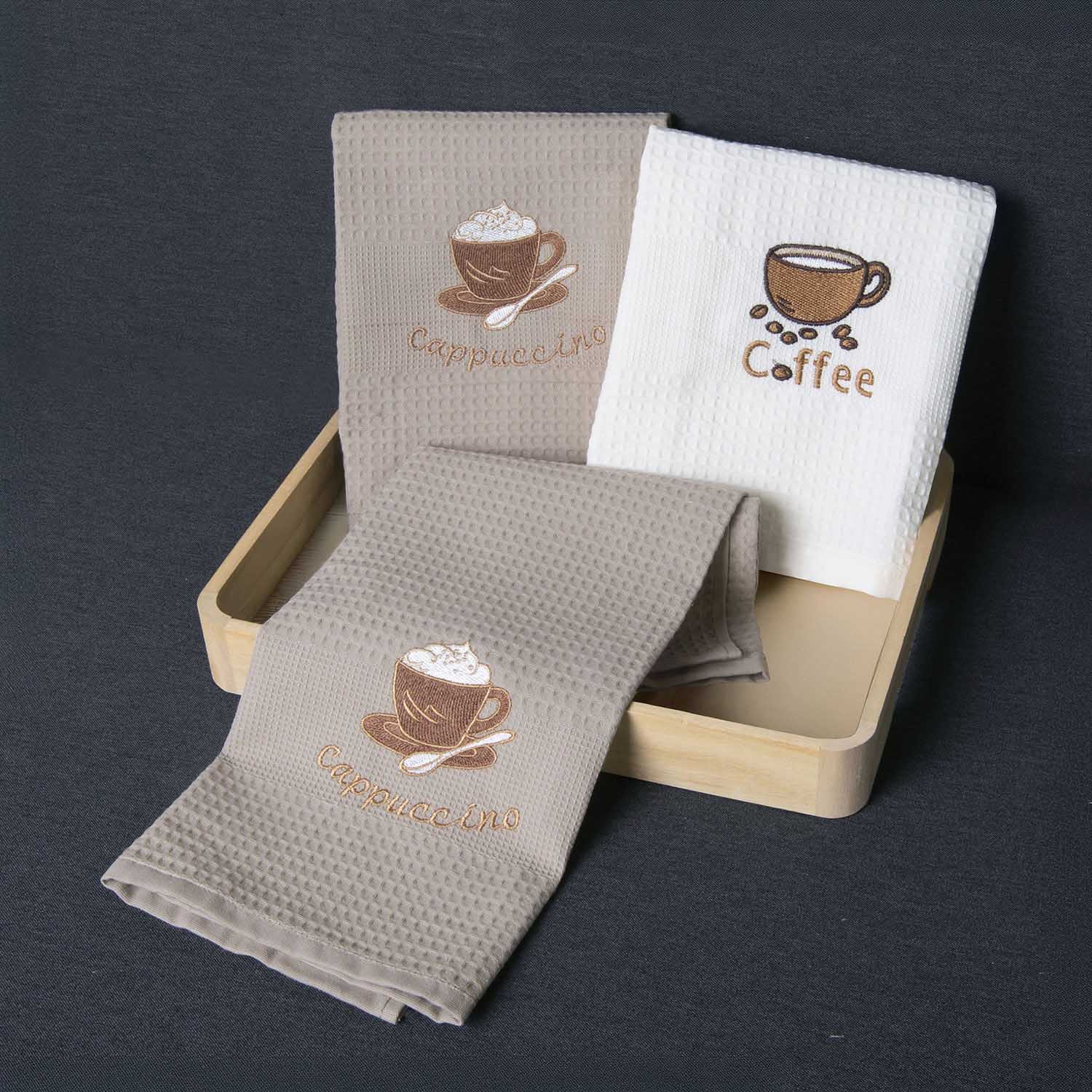 Кухонные полотенца из 100% хлопка с вафельным плетением, украшенные вышитой аппликацией. Благодаря характерной вафельной структуре полотенца впитывают в несколько раз больше влаги, чем любые другие полотенца. Их отличает высокая мягкость и устойчивость к истиранию. Они легкие и простые в уходе. Они не выцветают даже после многократных стирок. Они упакованы в декоративную коробку. Набор состоит из 3 полотенец размером 50х70 см различных цветов и аппликаций. Набор полотенец изготовлен из тканей, сертифицированных OEKO-TEX.