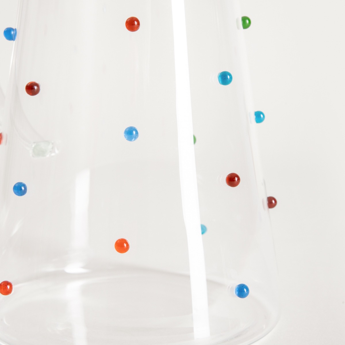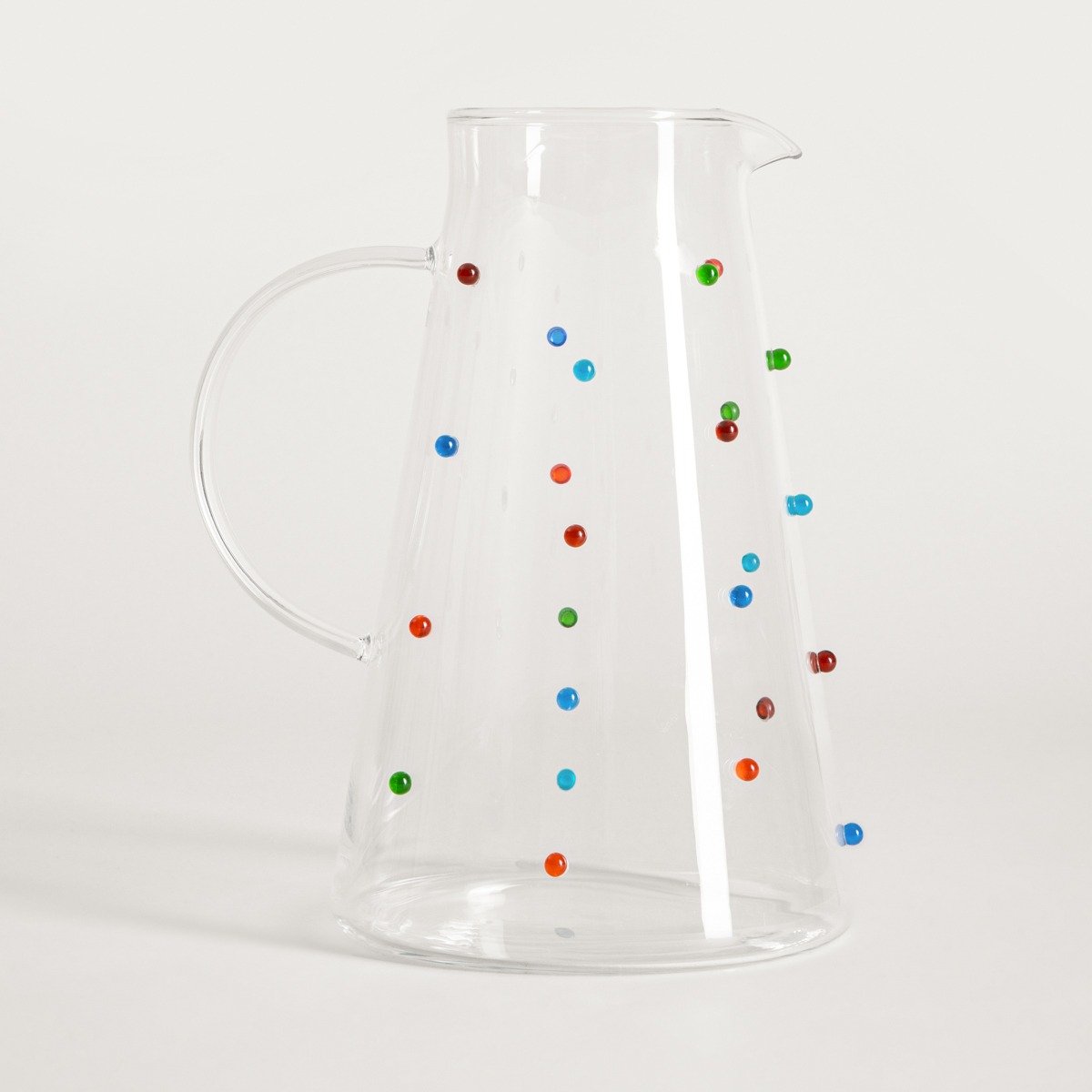 Кувшин DOPY — это яркий декоративный акцент и практичный сосуд в одном лице. Изготовленный из прозрачного стекла, он украшен оригинальными цветными шариками. Необычная форма и удобная ручка делают его функциональным аксессуаром.