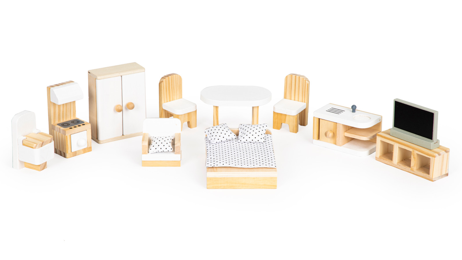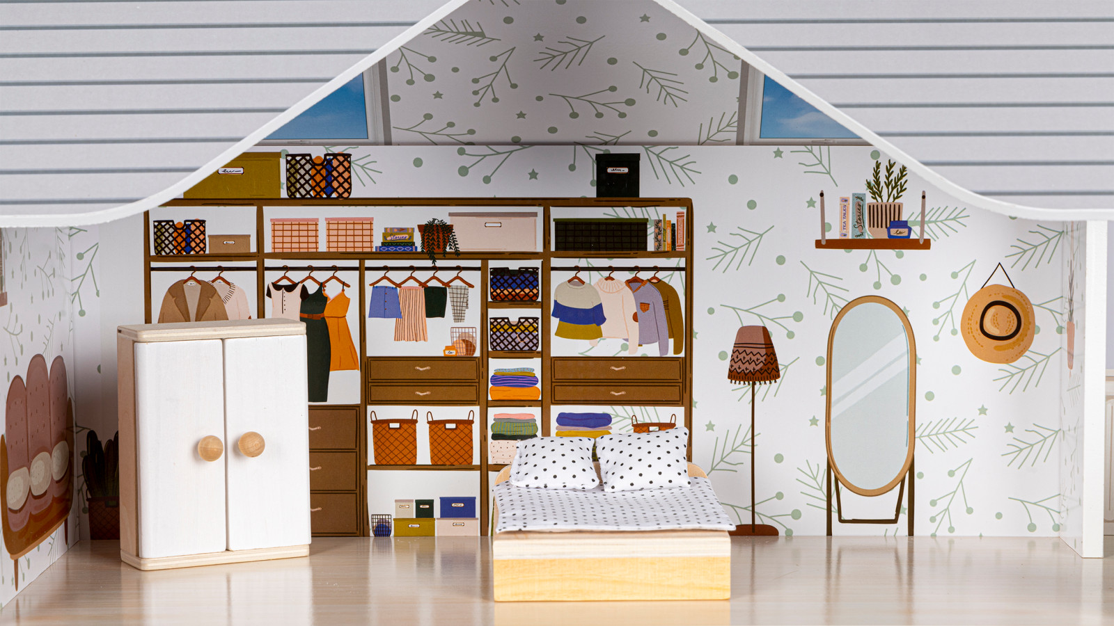 В набор также входит коллекция из 10 деревянных предметов мебели и аксессуаров, таких как пылесос, гитара, зеркало или домик для собаки. Все элементы можно свободно перемещать и переставлять.
