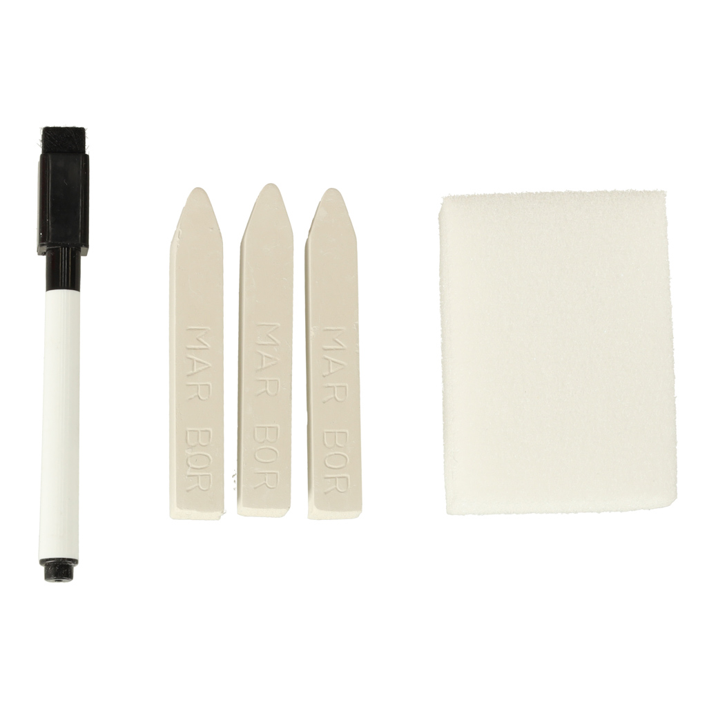 — содержит три белых мела, маркер сухого стирания, стирающуюся губку и магниты для букв
