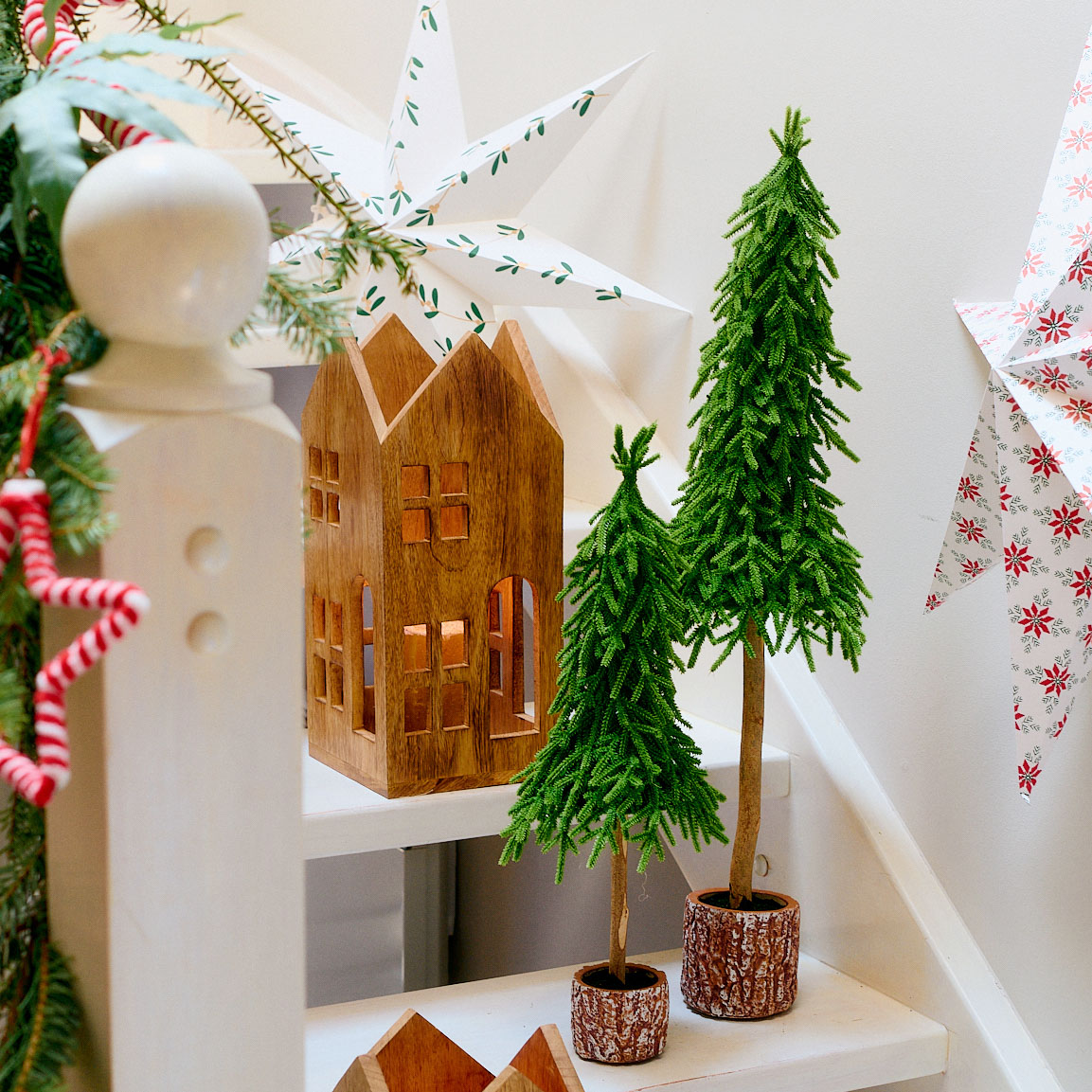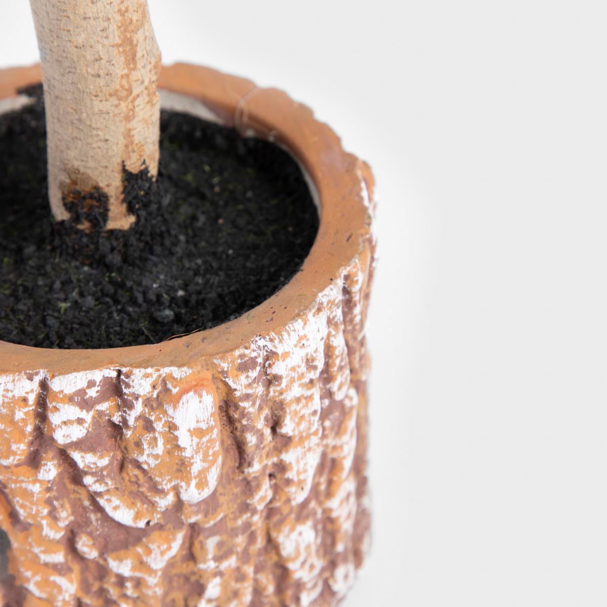 Высококачественный материал, обеспечивающий долговечность и легкий уход за ветками. Ствол елки выполнен из дерева. Основание, стилизованное под натуральный ствол, придает деревенский колорит.