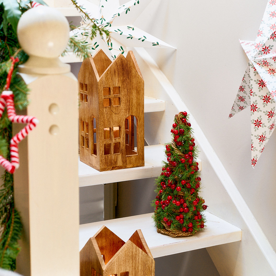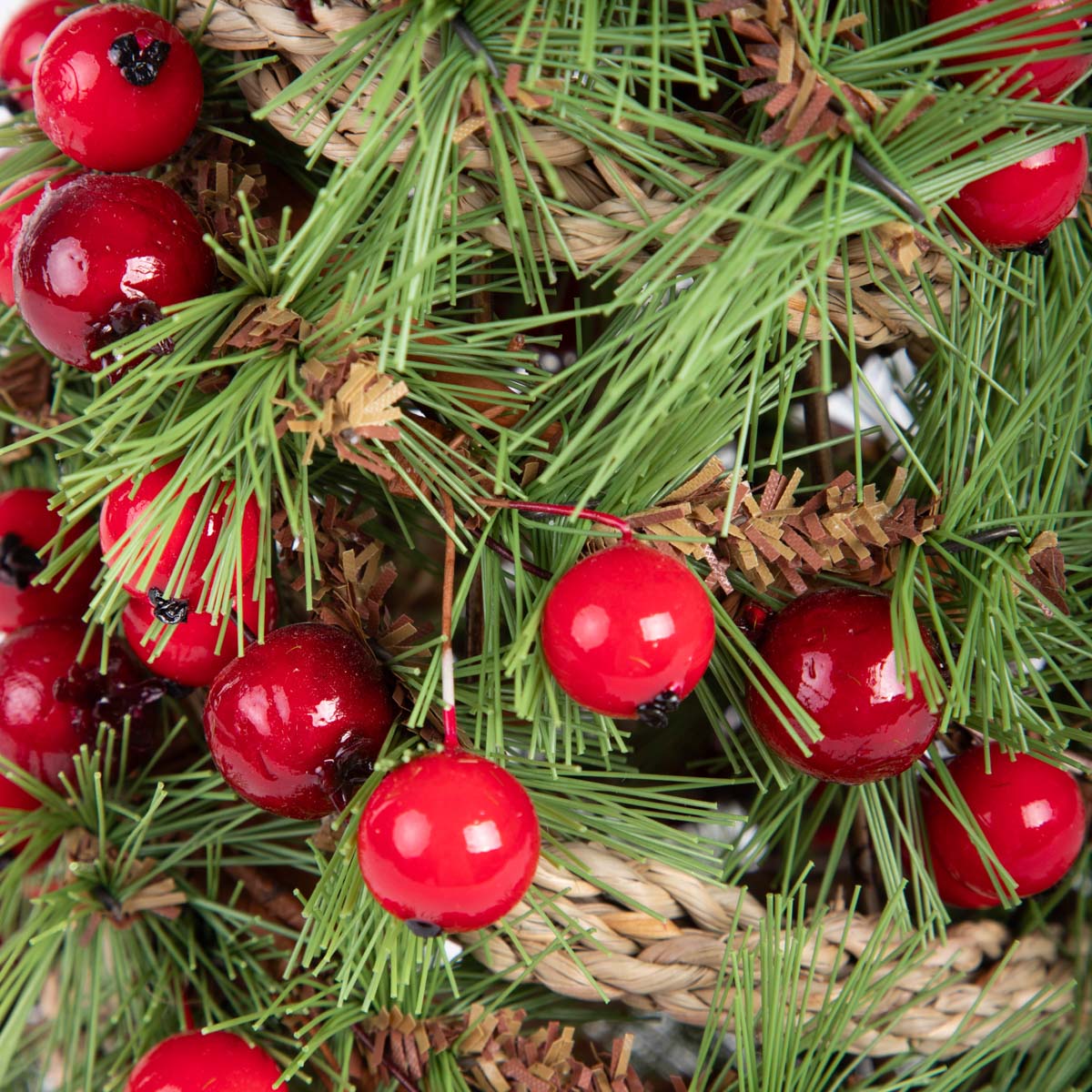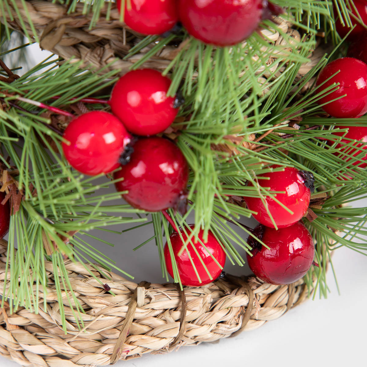 Рождественская елка поражает своим природным очарованием и простотой. Она сделана из зеленых иголок и украшена насыщенно-красными ягодами, которые выглядят почти как живые растения. Ее плетеная натуральная основа придает деревенский оттенок, который идеально впишется в рождественскую атмосферу.