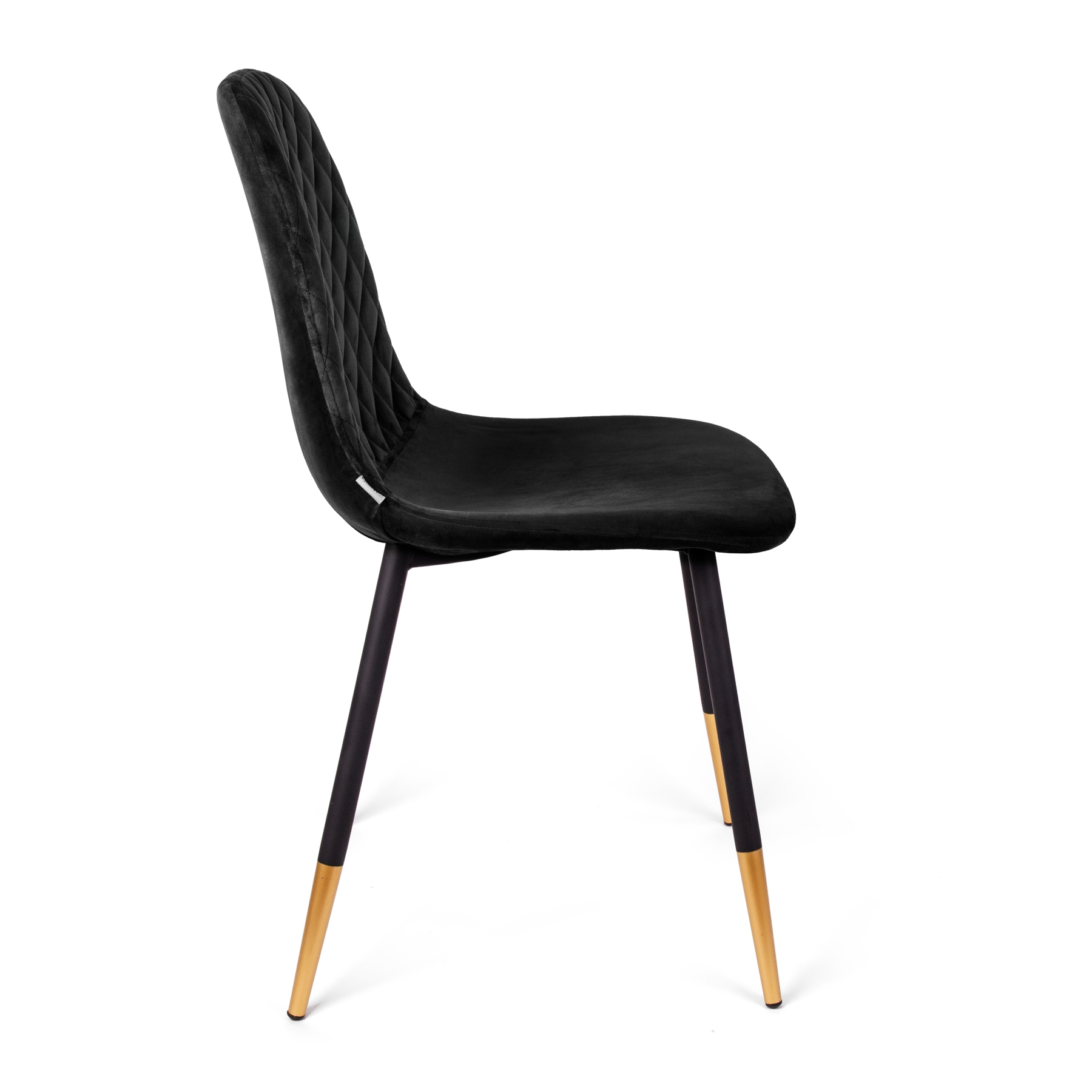 Стул NOIR имеет устойчивые металлические ножки, окрашенные в глубокий черный цвет и украшенные золотыми элементами. Черная велюровая ткань обивки отличается устойчивостью к повреждениям и истиранию, а также очень приятна на ощупь. Материал лучше всего чистить влажной тканью.