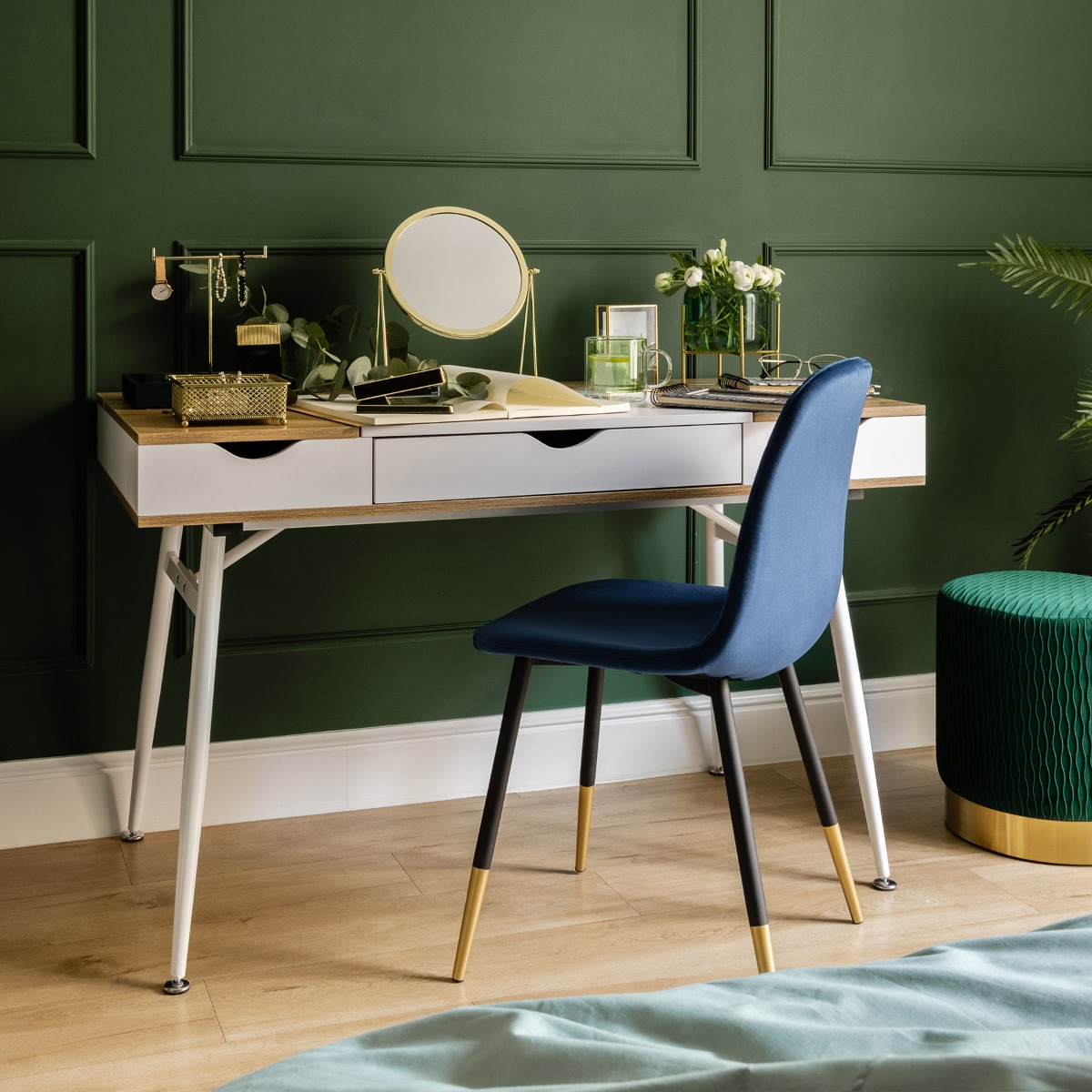 Г-образные сиденье и спинка стоят на прямых двухцветных круглых ножках. Красивая обивка королевского синего цвета украшена симметричной стежкой, создающей на ней ромбовидный узор. Мягко профилированная спинка обеспечивает максимальный комфорт и прилегание к телу пользователя.