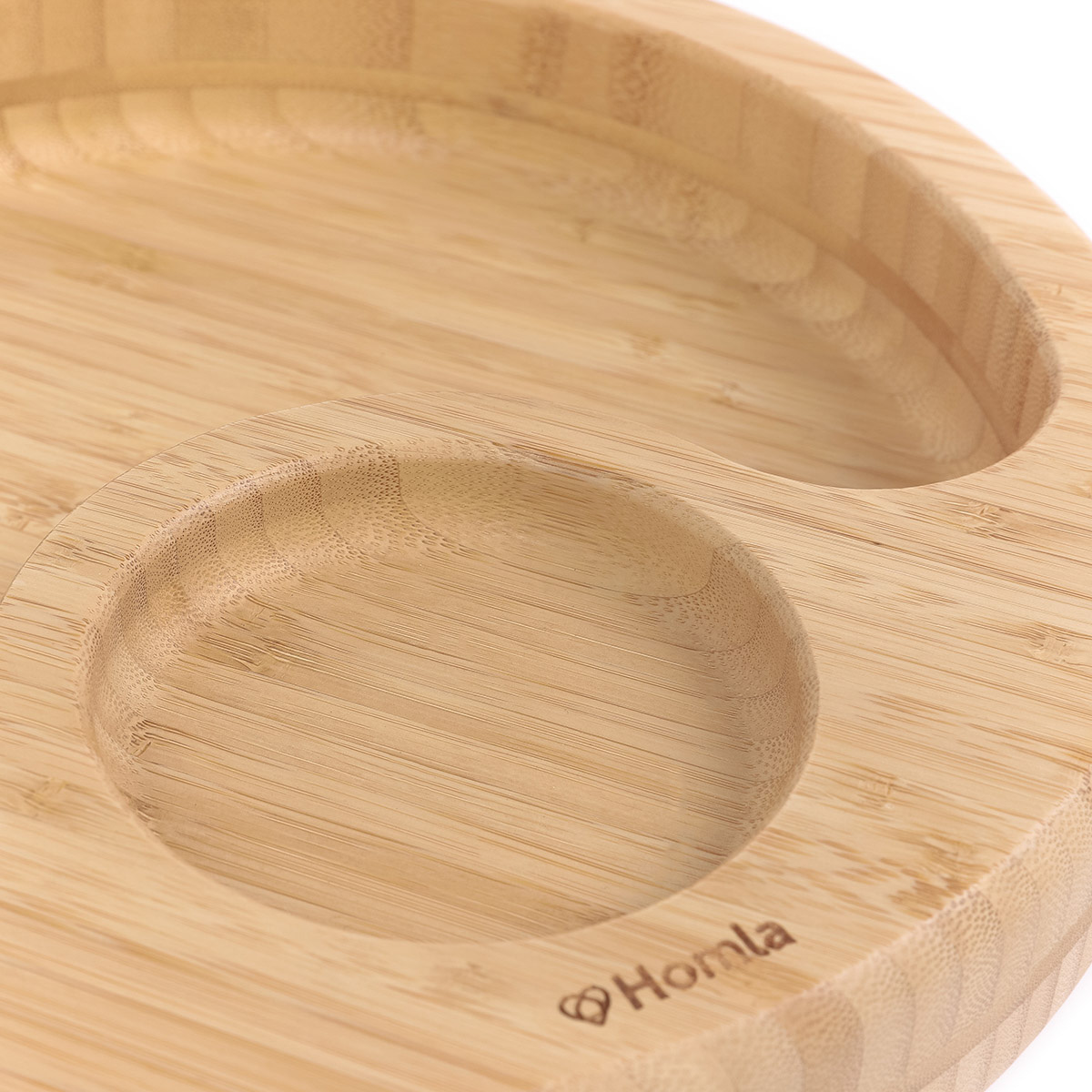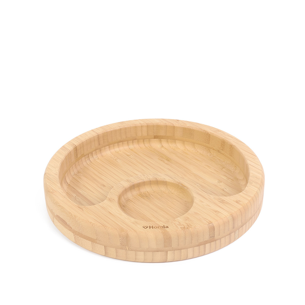 Блюдо BAMBOU — это аксессуар, который пригодится для подачи закусок в гостях, хотя ничто не мешает использовать его и в повседневной жизни. На ее поверхности выдолблены две формы — небольшой круг и конус с закругленными краями. В большее отверстие можно поместить любую закуску, а в меньшее — миску с соусом.