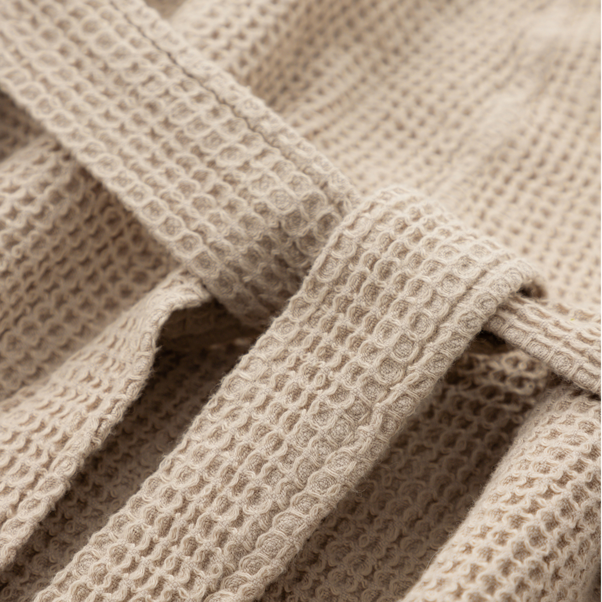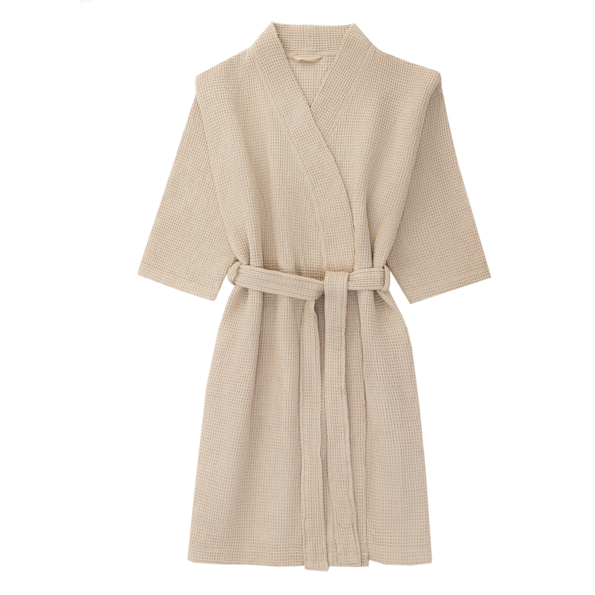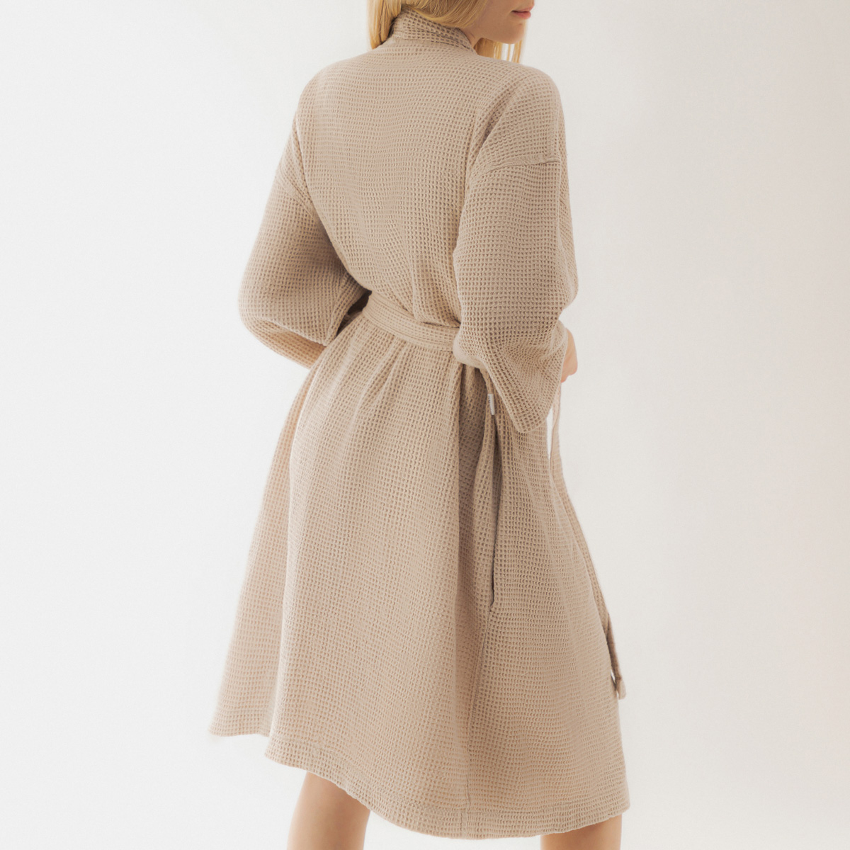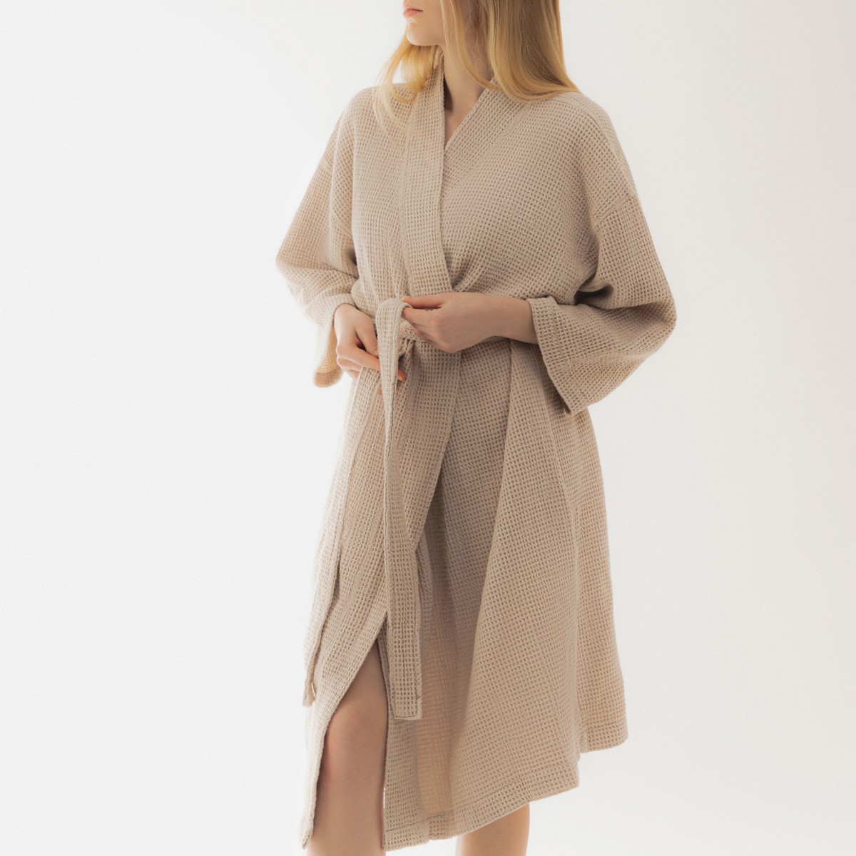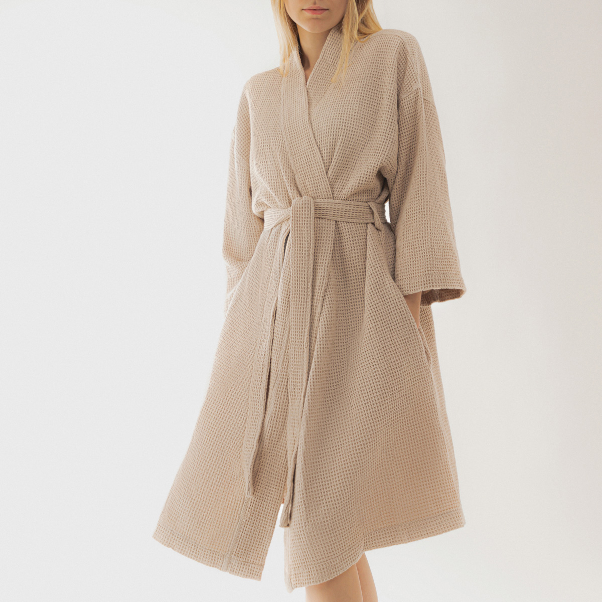 Вы любите заботиться о своей коже и стараетесь дать ей все самое лучшее? Если да, то халат VAFFEL непременно придется вам по душе! Его мягкий и легкий материал приятно окутает ваше тело и позволит коже свободно дышать. Халат имеет прямой крой, который адаптируется к телу после завязывания на талии с помощью шнурка. В нем есть два кармана для хранения мелких вещей и ручка, позволяющая повесить его на вешалку в ванной. Бежевый цвет халата прекрасно подчеркивает нежность вашей кожи, а вафельная ткань придает ему великолепный вид.