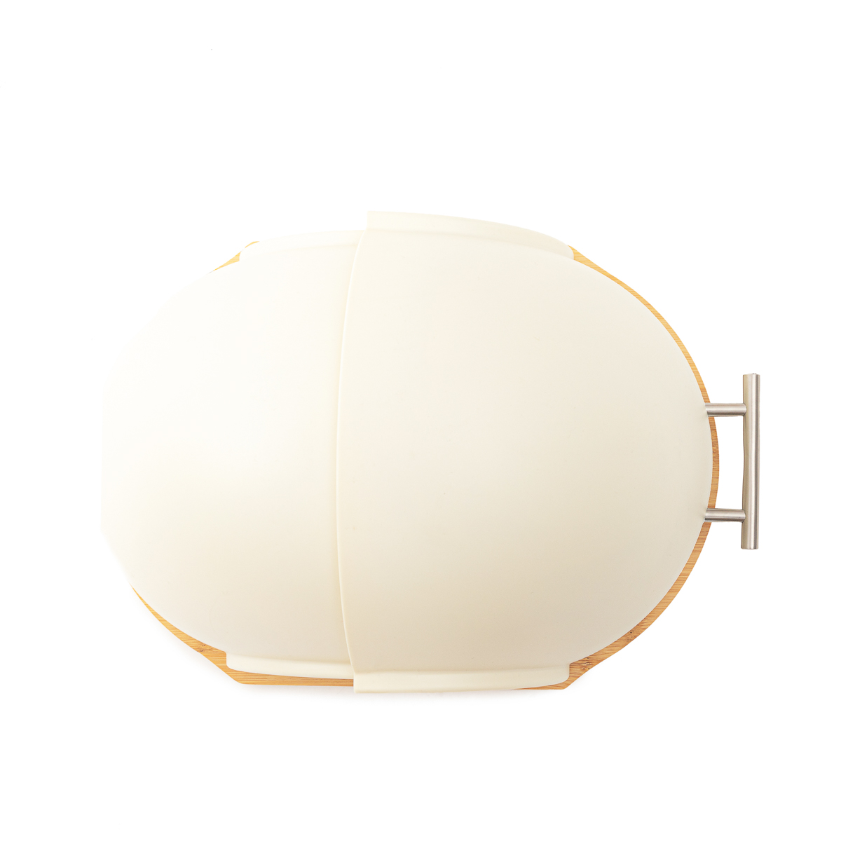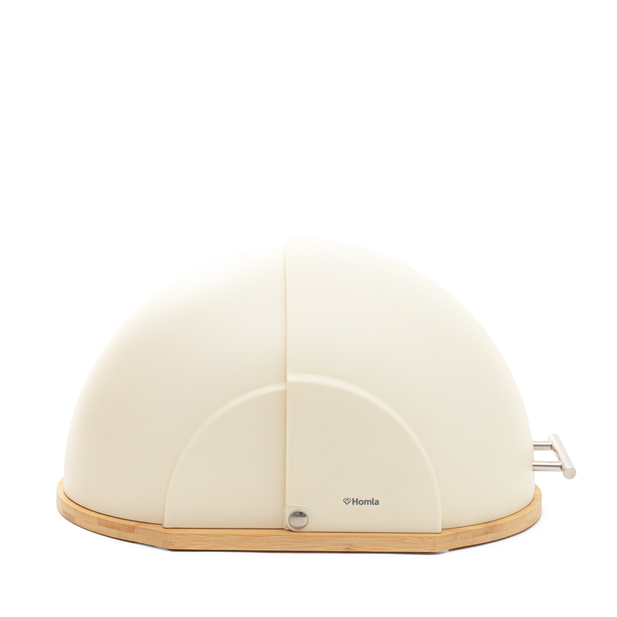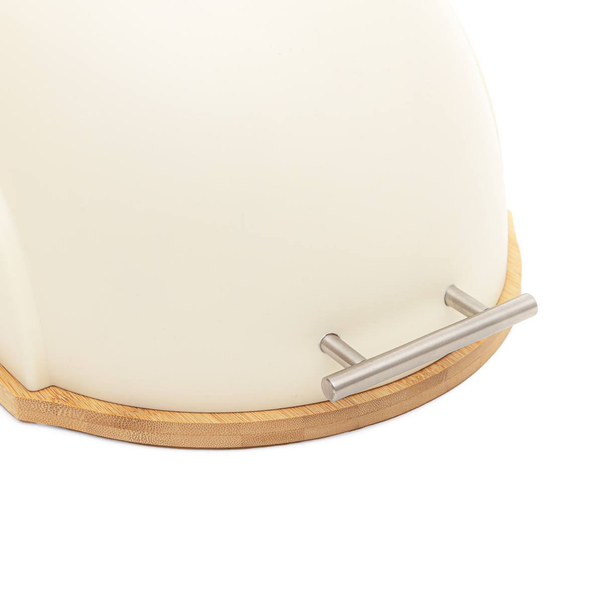 Основа хлебницы — натуральная бамбуковая фанера, отличающаяся твердостью, устойчивостью к царапинам и воздействию влаги. Корпус изготовлен из высококачественного, легкого и прочного пластика. Ручки крышки изготовлены из стали.