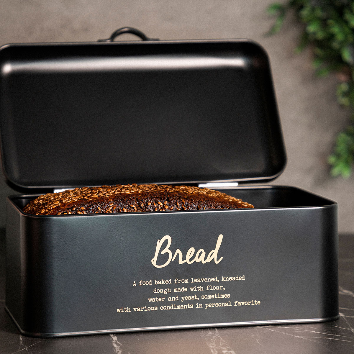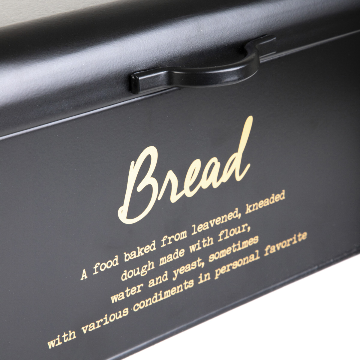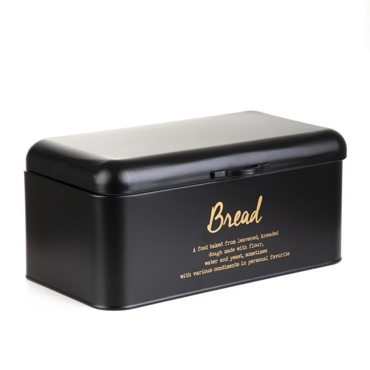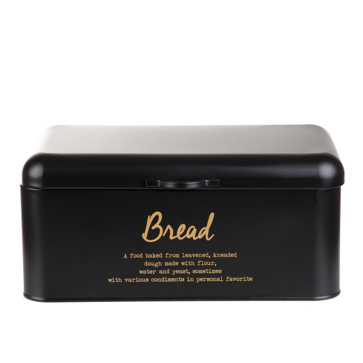 Металлическая хлебница HOMLA ESCILLE — элегантное и практичное дополнение к любой кухне. Он закрывается откидной крышкой с удобной ручкой, которая позволяет легко поднять крышку. Металлические стенки эффективно обволакивают хлеб, защищая его от высыхания, поэтому хлеб и булочки дольше остаются свежими. Черная поверхность контейнера украшена золотой надписью, благодаря чему хлебница отлично смотрится на столешнице.