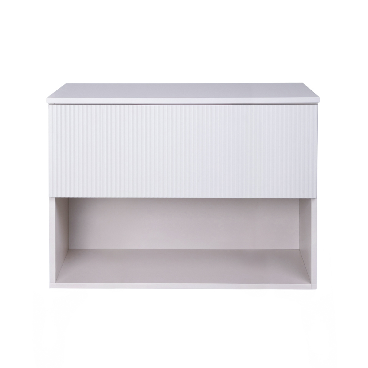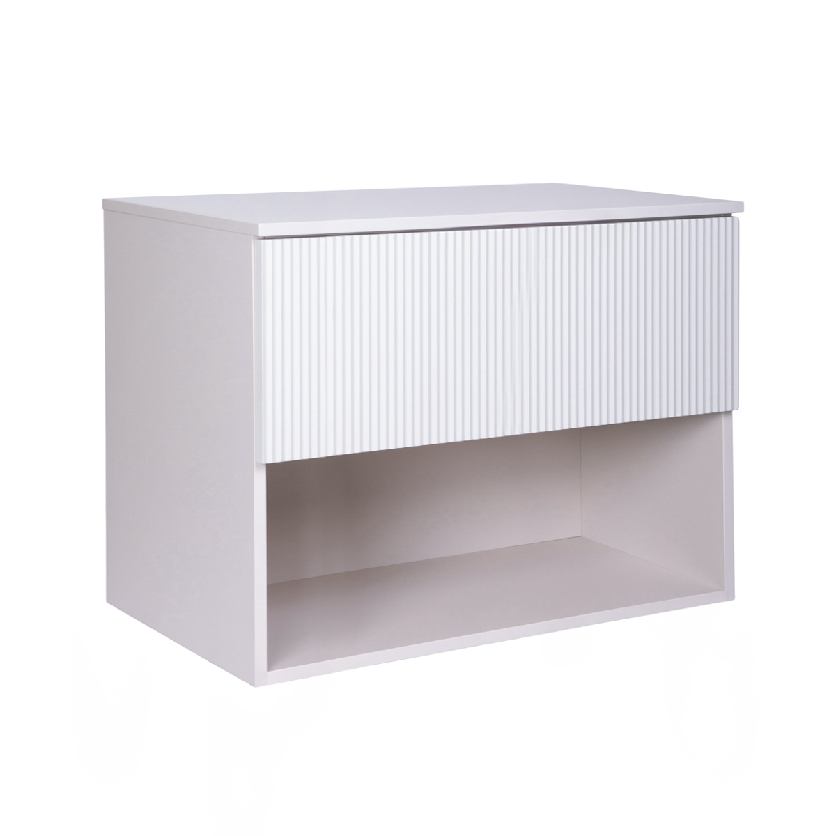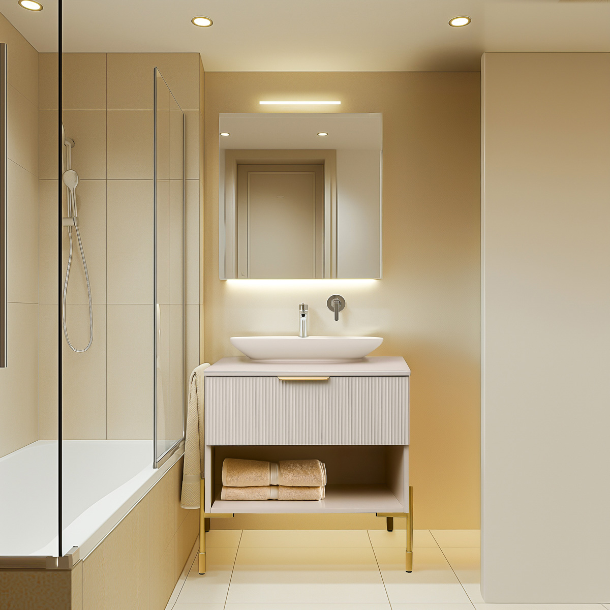 Тумба NAVADO имеет единый корпус с выдвижным ящиком и открытой полкой. В ней найдется место для косметики, банных принадлежностей, фена, косметики и полотенец. Простая, легкая форма в сочетании с фрезерованными фасадами ящиков создает фантастический визуальный эффект. Тумба подходит ко многим стилям оформления ванной комнаты — современному, скандинавскому, гламурному, японскому.