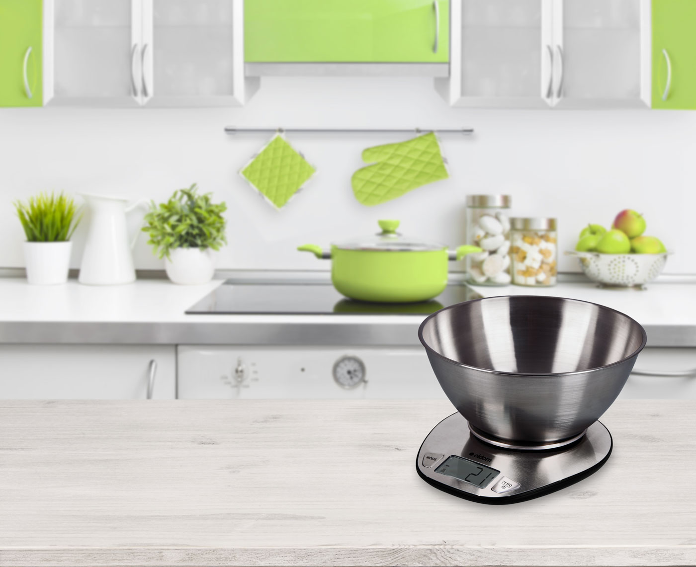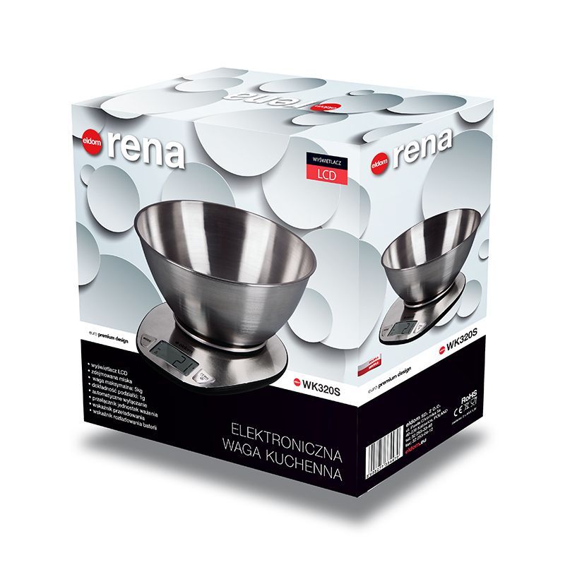 Помимо основной функции взвешивания продуктов и тарирования, модель WK320S также позволяет измерять объем воды и молока. Эта функция означает, что количество молока или воды можно также измерять в литрах. Кухонные весы Eldom EK3052 с чашей, серебристые, модель Rena
