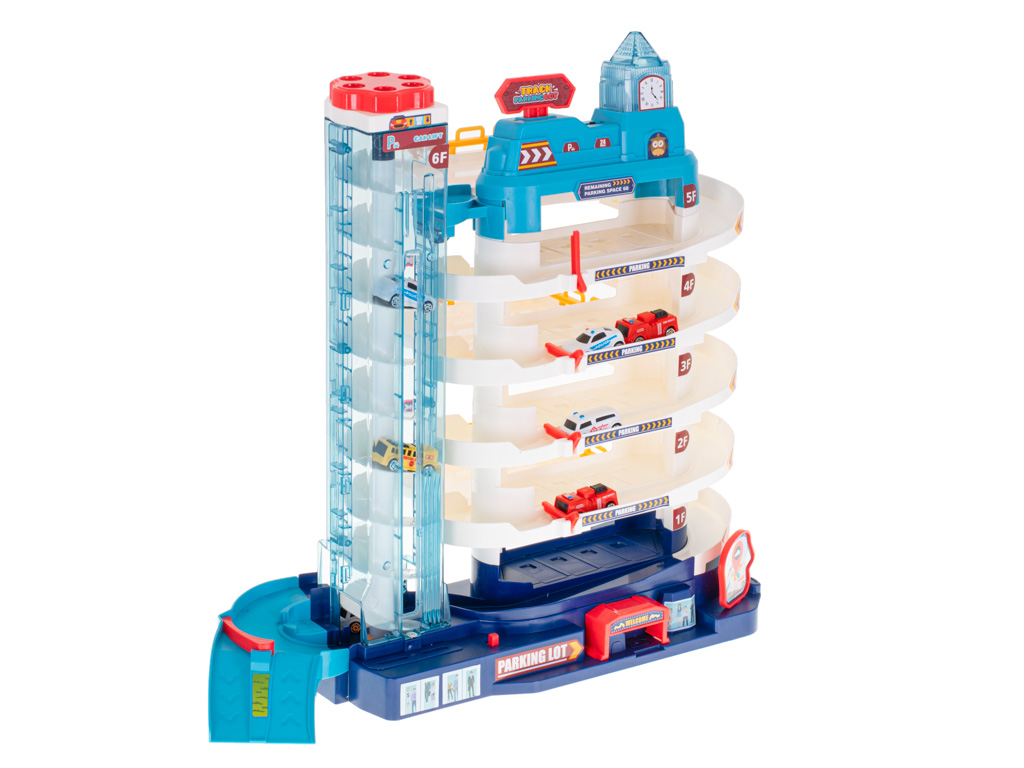На парковке есть пять уровнейдля парковки автомобилей, которые вы найдете в наборе. На самый верх парковки машинки могут подняться на автоматическом лифте.