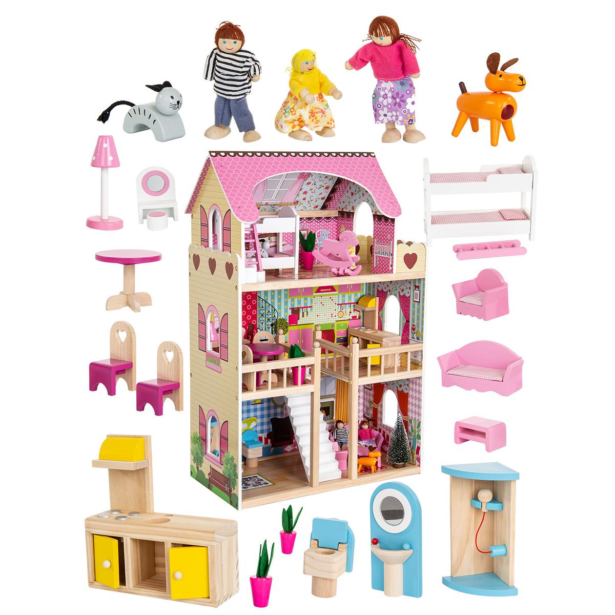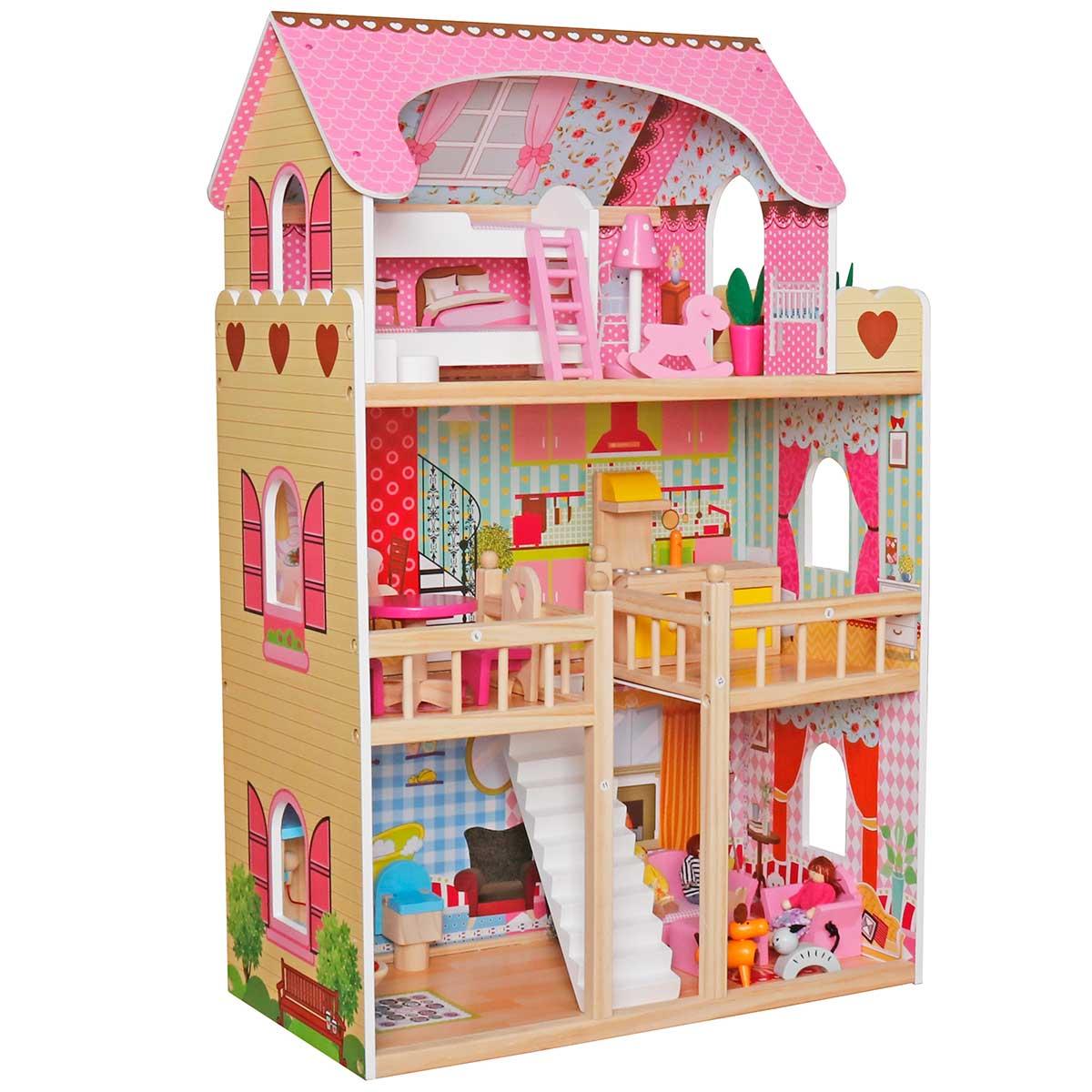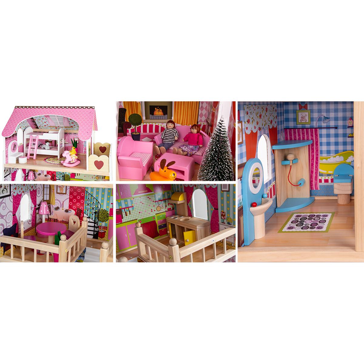 В каждой комнате этого чудесного деревянного коттеджа есть окно, через которое проникает свет. Красочные стены украшены различными предметами и элементами, дополняющими комнаты, а фасад домика украшают разнообразные красочные цветы, заборчик, лампы, а на окнах красуются красивые ставни. Весь набор обязательно оправдает ожидания и мечты каждого, кто мечтал о собственном кукольном домике.
