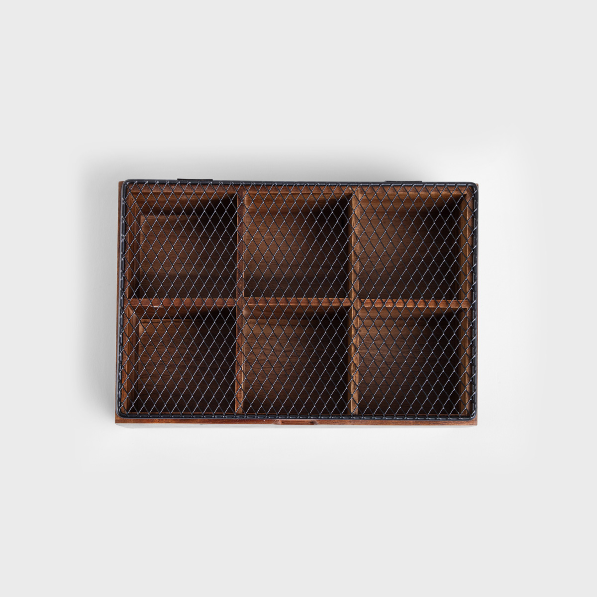 Органайзер изготовлен из твердой древесины акации, а крышка — из стальной сетки.