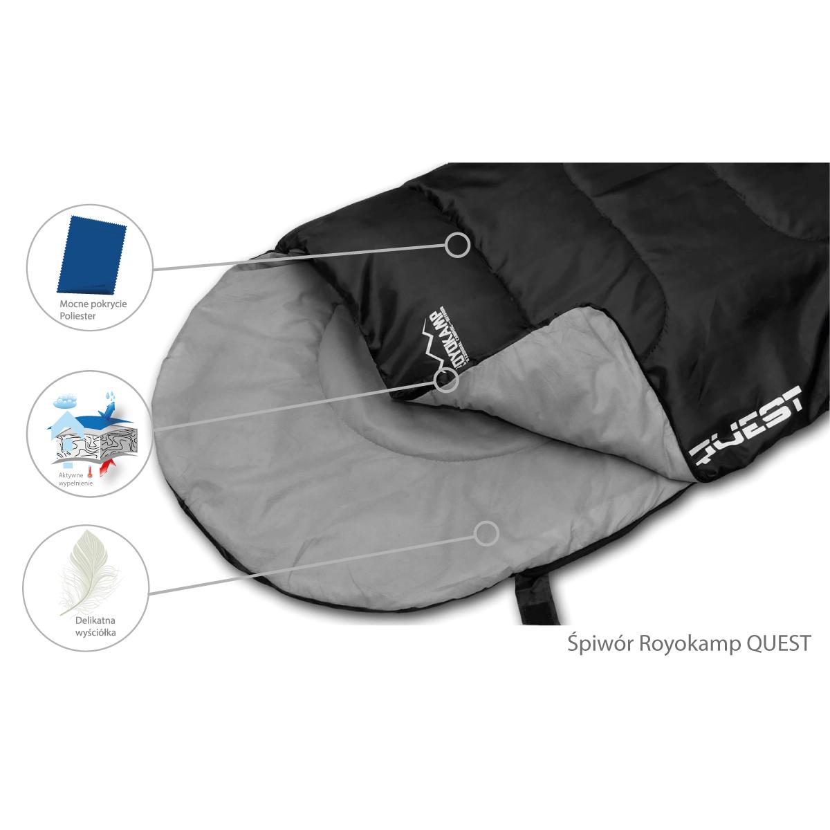 Спальный мешокQUEST — это практичный классический спальный мешок, сочетающий в себе преимущества одеяла и спального мешка. Он идеально подходит для школьных поездок, походов, лагерей, а также под палатку. Наполнитель не впитывающий, антиаллергенный, быстросохнущий и легкий, а прострочка по всей поверхности предотвращает его смещение. Специальный материал, из которого он изготовлен, сохраняет свои согревающие свойства даже во влажных условиях. Благодаря специальным ремням спальный мешок можно сжать до минимального размера. Не медлите с покупкой! Туристический спальный мешок-пуховик 210 x 70 см Quest black оправдает ваши ожидания!